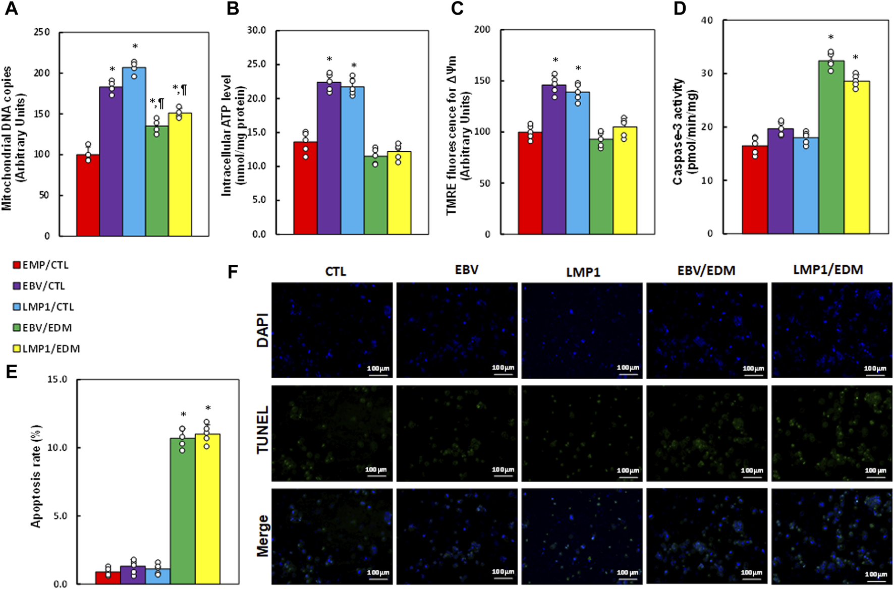 We investigated the impact of EDM treatment and transient EBV/LMP1 exposure on mitochondrial function. Results revealed that pre-treatment with either EBV or LMP1 significantly enhanced mitochondrial replication (see Figure 4A), intracellular ATP levels (see Figure 4B), and mitochondrial membrane potential (see Figure 4C; Supplementary Figure S5) compared to the EMP/CTL group. EDM treatment either partially or completely reversed this effect. Additionally, EBV/LMP1 pre-treatment had minimal impact on caspase-3 activity (see Figure 4D) and apoptosis rate (see Figures 4E, F), while EDM treatment significantly elevated these levels compared to the EMP/CTL group.