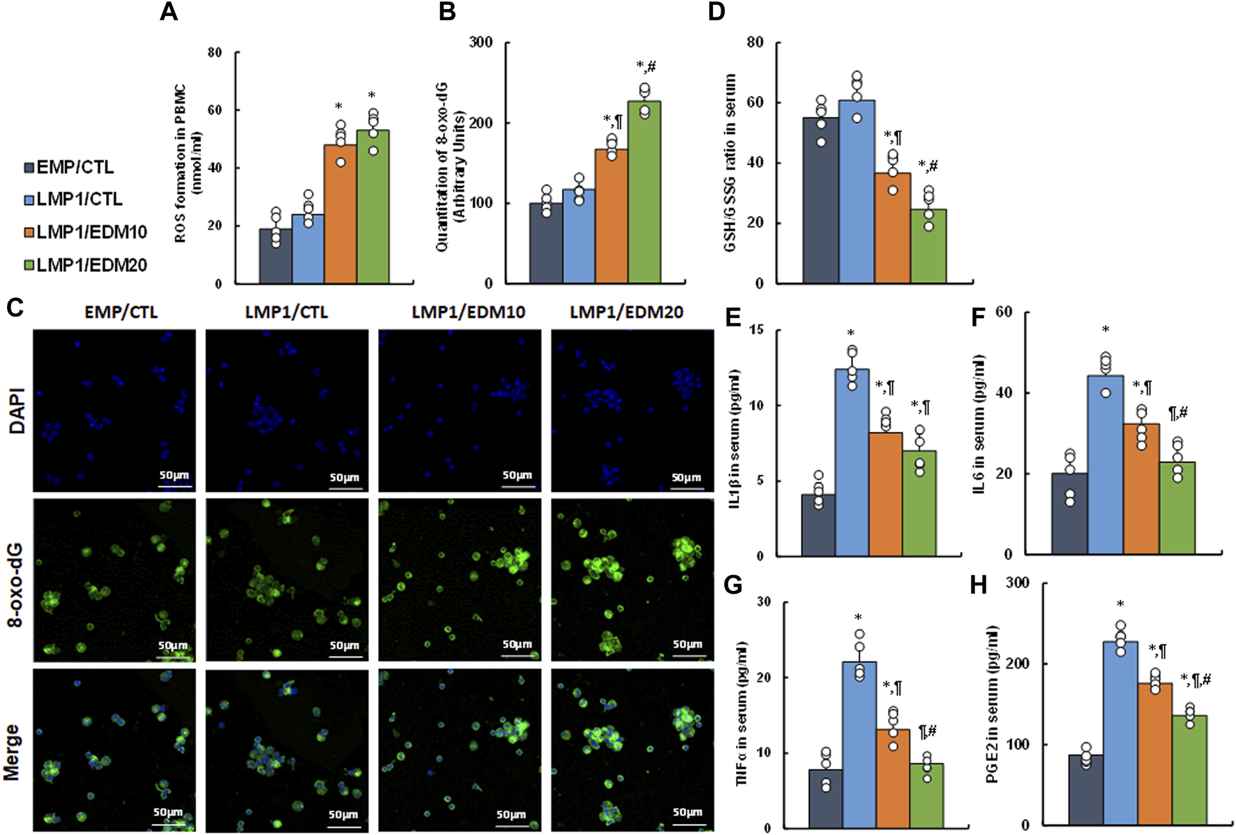 A mixture of LMP1-pretreated HESC and HEEC cells was intraperitoneally administered as an endometriosis model and treated with either 10 mg/kg of EDM (EDM10) or 20 mg/kg of EDM (EDM20). PBMC and serum were isolated for biological assays. Initial assessment of redox balance in PBMC showed that LMP1 pre-treatment had minimal effect on ROS formation (see Figure 6A) and 8-oxo-dG formation (see Figures 6B, C) in PBMC, whereas EDM treatments significantly intensified these effects compared to the EMP/CTL group. Subsequent evaluation in the serum demonstrated that LMP1 pre-treatment had marginal impact, whereas EDM treatments significantly reduced the GSH/GSSG ratio compared to the EMP/CTL group; notably, EDM20 treatment exhibited a stronger effect than the EDM10 group (see Figure 6D). Moreover, LMP1 pre-treatment significantly increased proinflammatory cytokine release, including IL1β (see Figure 6E), IL6 (see Figure 6F), TNFα (see Figure 6G), and PGE2 (see Figure 6H), compared to the EMP/CTL group. EDM10 treatment partially, and EDM20 treatment almost completely (except for IL1β), reversed this effect.