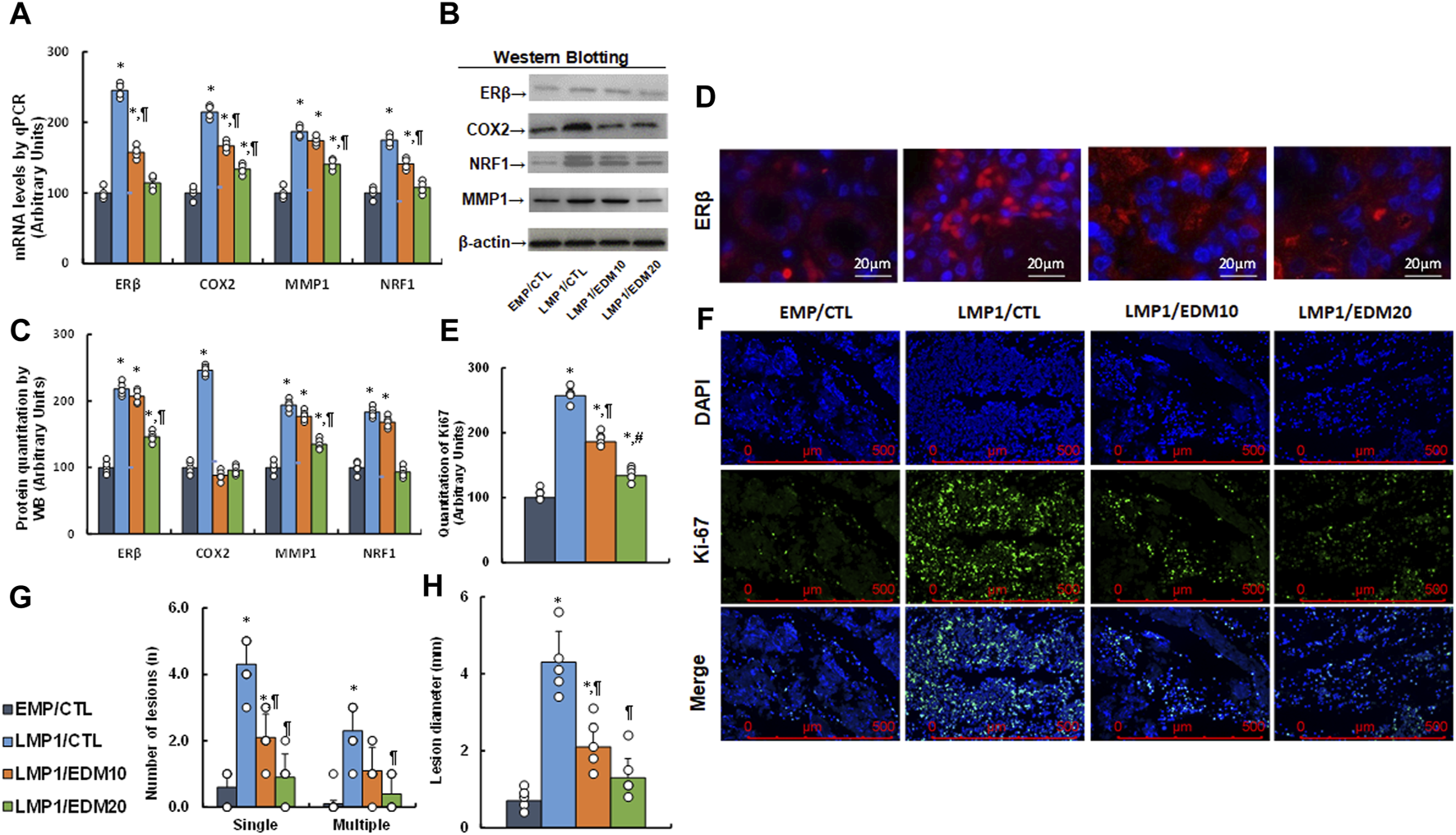 EDM suppresses ERβ and cell growth in LMP1-mediated endometriosis mouse model. The mixture of immortalized human HESC and HEEC cells were pre-treated with either empty control (EMP) or LMP1 adenovirus, then cells were administered intraperitoneally, and the experimental mice were then treated by control (CTL), 10 mg/kg of EDM (EDM10) or 20 mg/kg of EDM (EDM20), then the endometriosis tissues were isolated for biological assays. (A) mRNA levels by qPCR, n = 4. (B) Representative western blots. (C) Quantitation of protein levels for (B), n = 5. (D) Representative pictures for ERβ staining. (E) Quantitation of Ki67, n = 7. (F) Representative pictures for (E). (G) Number of lesions, n = 7. (H) Lesion diameter, n = 7. *p < 0.05, vs. EMP/CTL group; ¶p < 0.05, vs. LMP1/CTL group; #p < 0.05, vs. LMP1/EDM10 group. Data were expressed as mean ± SD, one-way ANOVA was used for statistical analysis. Abbreviations EBV, Epstein-Barr virus; EDM, evodiamine; COX2, cyclooxygenase 2; ERβ, estrogen receptor β; LMP1, latent membrane protein 1; NRF1, nuclear respiratory factor-1; MMP1, matrix metalloproteinase-1; WB, Western blotting.