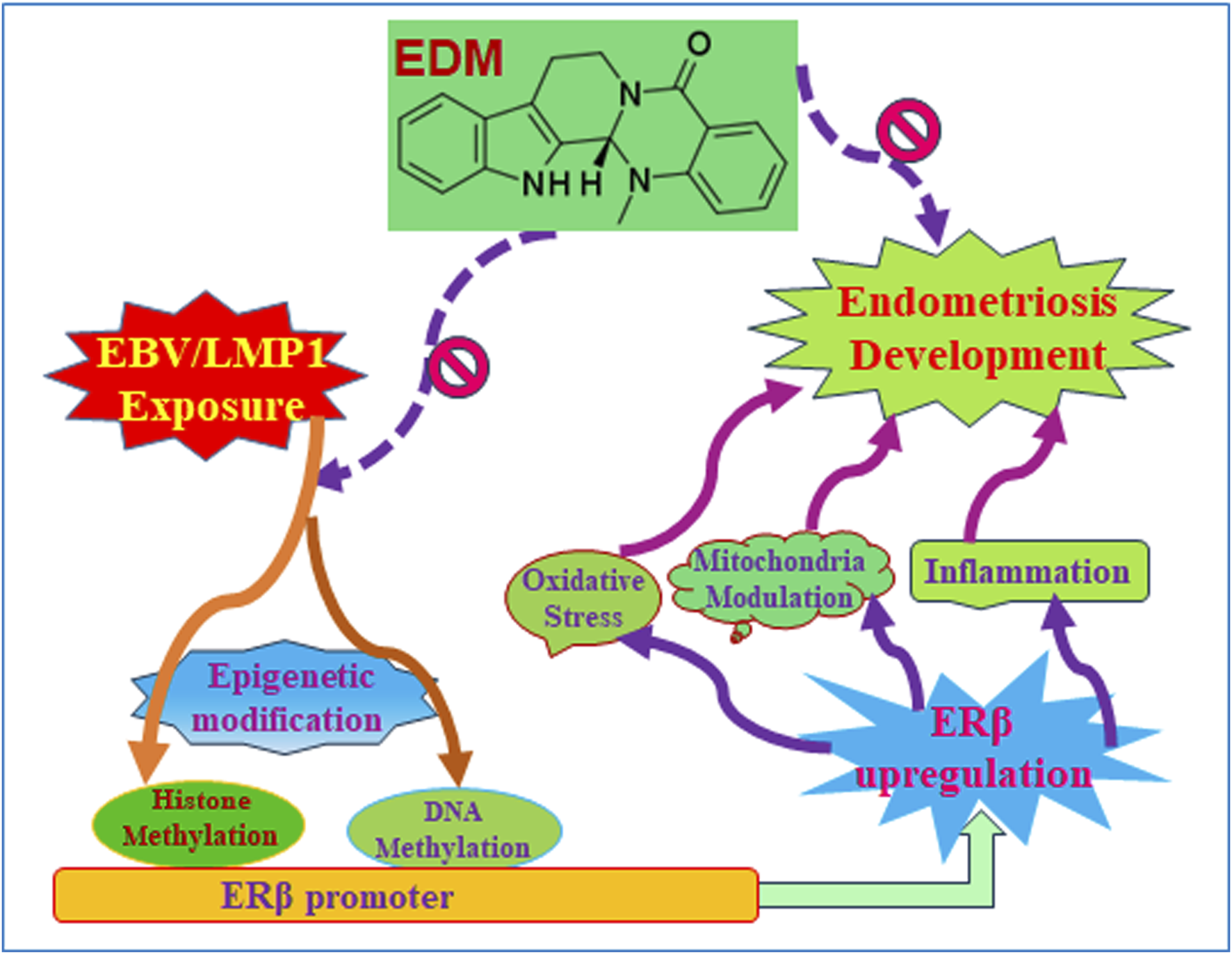 In our earlier research, we identified an association between endometriosis and ERβ upregulation, leading to the initiation of endometriosis development (Xiang et al., 2020). Nonetheless, the underlying mechanism responsible for the upregulation of ERβ in endometriosis remains elusive. In this investigation, our aim is to examine the possible mechanism behind the sustained expression of ERβ triggered by exposure to EBV or LMP1. Additionally, we aim to assess the inhibitory effect of evodiamine (EDM) on ERβ expression and its subsequent impact on suppressing endometriosis. Human endometrial stromal cells (HESC) or epithelial cells (HEEC) were immortalized and exposed to either EBV or LMP1 adenovirus transiently. Following the removal of EBV or LMP1, we monitored the expression of ERβ and its subsequent molecular properties related to proliferation, mitochondrial function, redox balance and pro-inflammatory cytokine release in an in vitro cell culture study. Also, we assessed the potential inhibitory impact of EDM on the expression of ERβ. Additionally, a mixture of EBV/LMP1 exposure-mediated HESC and HEEC cells was administered intraperitoneally to generate an endometriosis mouse model (Banu et al., 2008; Arosh et al., 2015; Arosh et al., 2022), and the inhibitory effect of EDM on endometriosis development was evaluated.