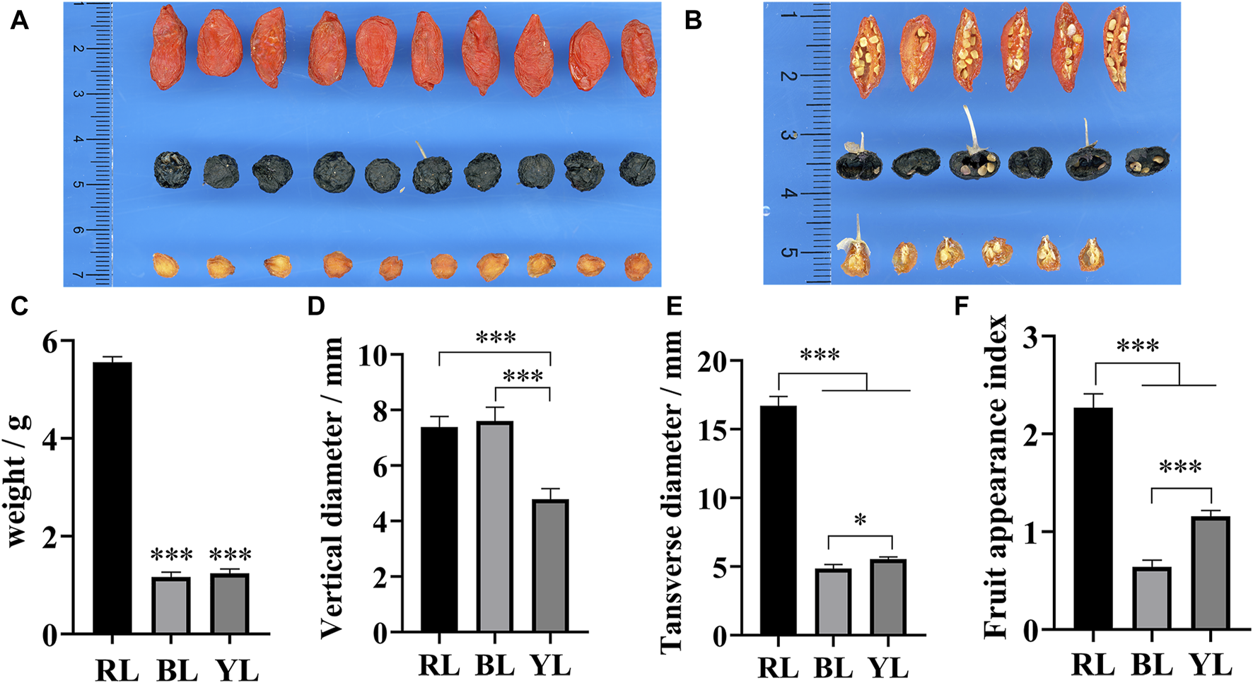 Figure 2. Appearance and cross-section of different wolfberries fruits. (A) Appearance of wolfberries fruit; (B) cross-section of wolfberries fruit; (C) weight of wolfberries fruit; (D) transverse diameter of wolfberries fruit; (E) longitudinal diameter of wolfberries fruit; (F) the ratio of longitudinal to transverse diameter of wolfberries fruit. * and *** represent a significant correlation at the p < 0.05 and p < 0.001 levels, respectively.
