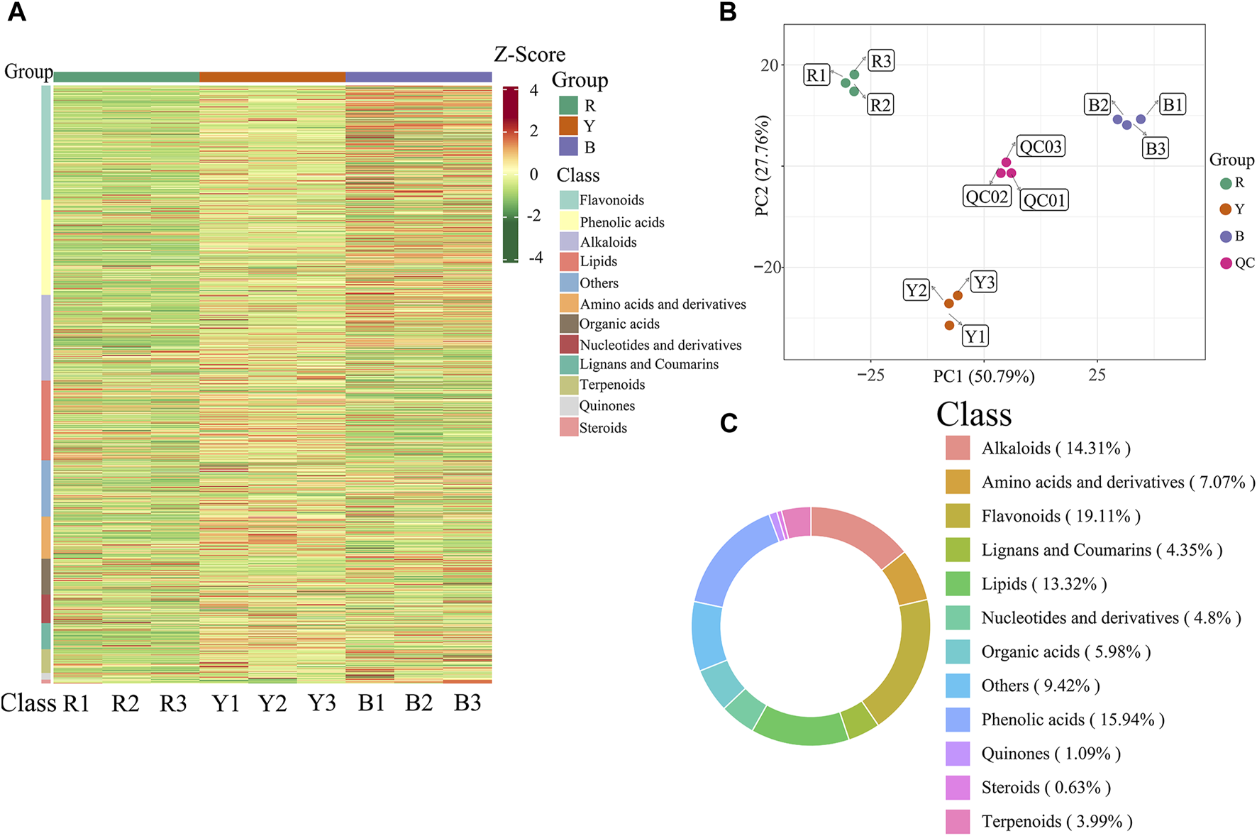 Figure 3. Heatmap of the metabolites under different wolfberries (A), the PCA score plot (B), the composition of the metabolites of wolfberry fruits (C). In the PCA score plot, the abscissa is the first principal component PC1, the ordinate is the second principal component PC2. Each point represents a sample, and different groups are marked with different colors. The number in parentheses is the score of the principal component, which indicates the percentage of the overall variance explained by the corresponding principal component.