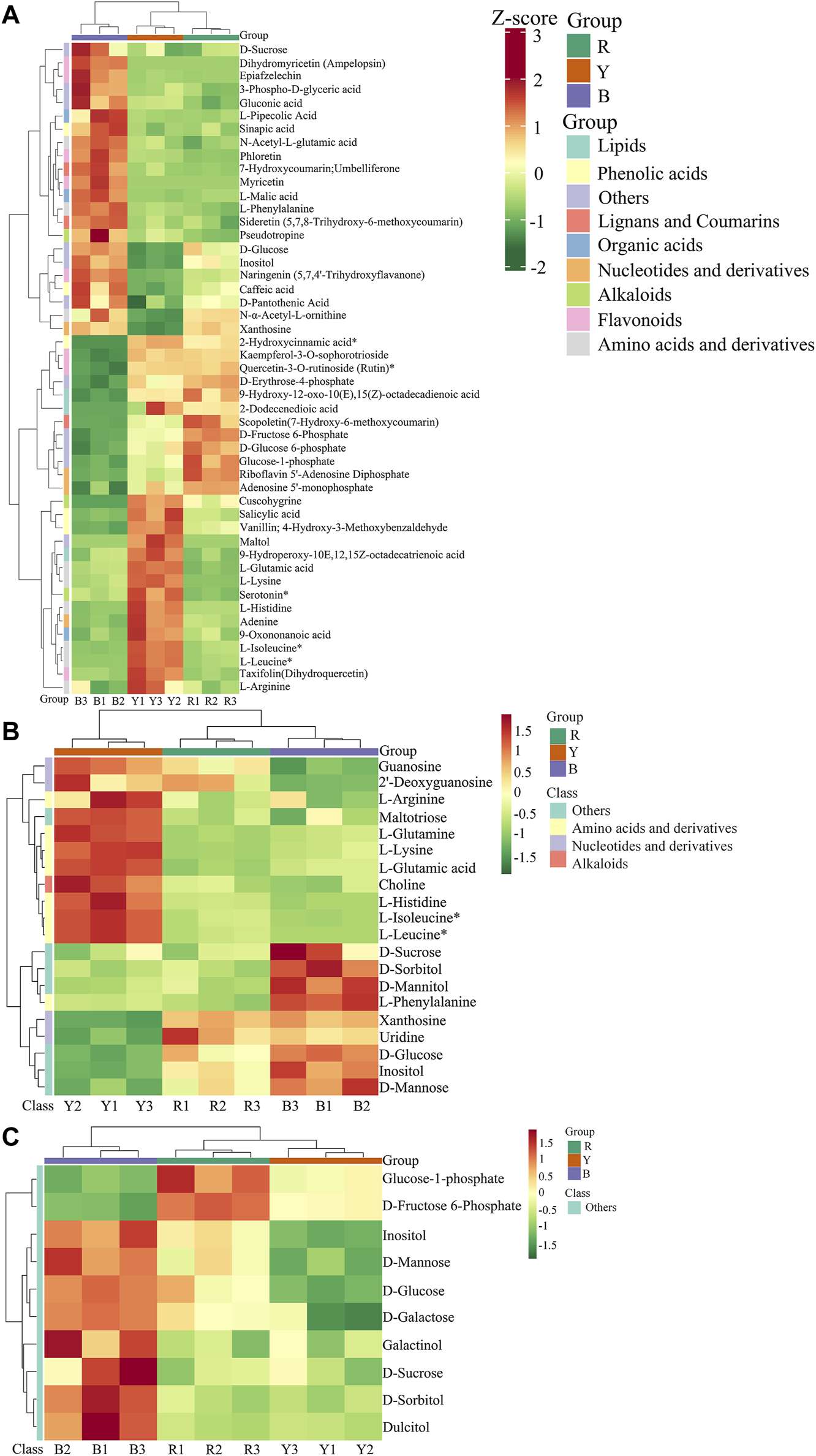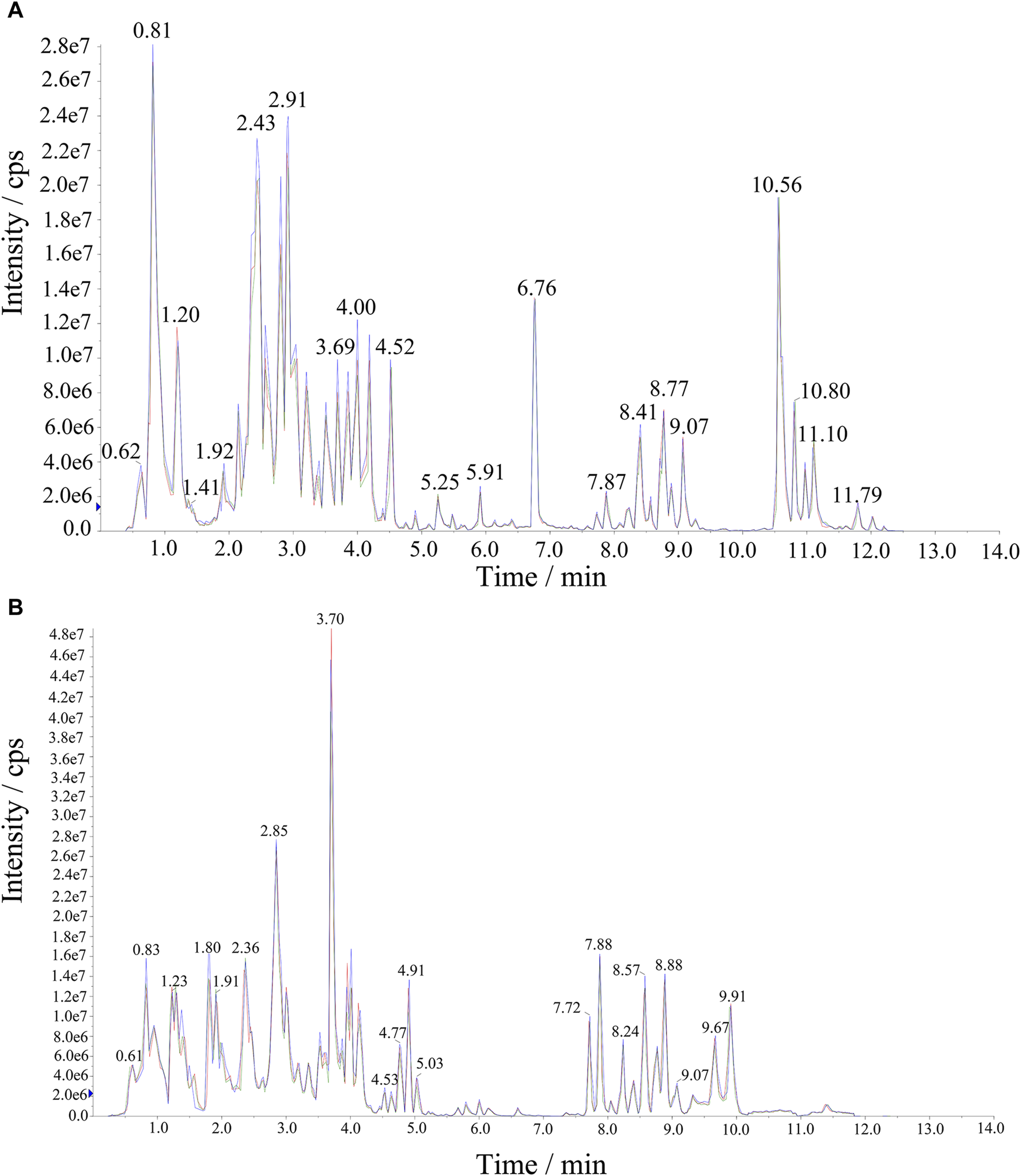 The analysis was conducted by MetWare (Wuhan, China). The sample extracts were analyzed using a UPLC-MS/MS system (UPLC, SHIMADZU Nexera X2; MS/MS, Applied Biosystems 4500 QTRAP). The following analytical conditions were employed: UPLC: column-Agilent SB-C18 (1.8 µm, 2.1 mm*100 mm); phase A-ultra-pure water containing 0.1% formic acid; phase B-acetonitrile containing 0.1% formic acid. The sample measurements were performed with a gradient program, starting with 95%A and 5%B. Within 9 min, the proportion of phase B increased to 95% and remained constant for 1 min. The proportion of phase A was reduced to 5% in the 10.00–11.10 min range and equilibrated at 5% until 14 min. The flow rate was set at 0.35 mL/min, the column temperature was maintained at 40°C, and the injection volume was 4 μL. The effluent was then connected to an ESI-triple quadrupole linear ion trap (QTRAP)-MS (Heinrich et al., 2022).