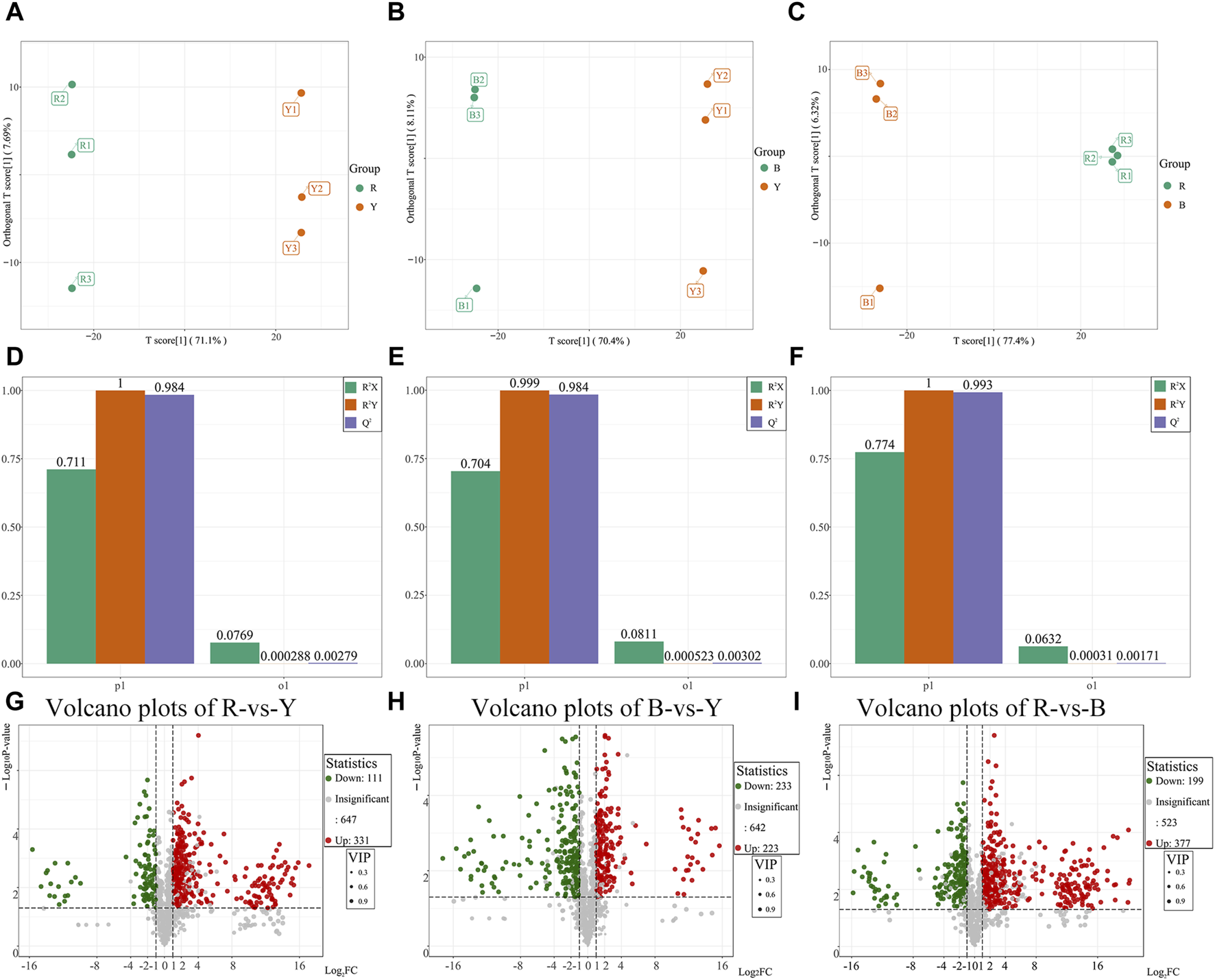 Figure 5. Differential metabolites analysis and Venn diagram of different wolfberries. (A–C): Score plots generated from OPLS-DA in RL vs. YL groups (A), the BL vs. YL groups (B), the RL vs. BL group (C). (D–F): OPLS-DA verification diagram between RL vs. YL groups (D), the BL vs. YL groups (E), the RL vs. BL group (F). (G–I): Volcano plots showing the differential metabolites expression levels between RL vs. YL groups (G), the BL vs. YL groups (H), the RL vs. BL group (I).