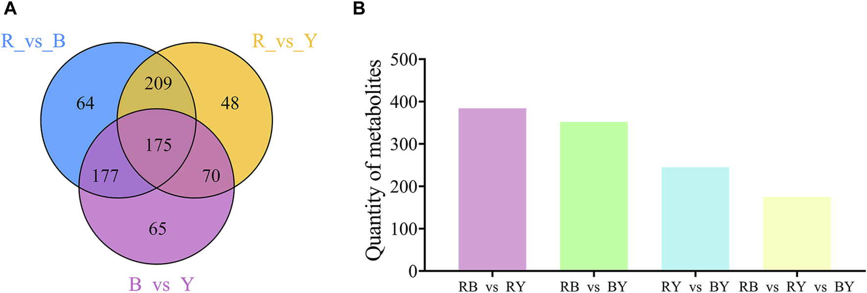 Figure 6. Venn diagram (A) and histogram (B) illustrating the overlapping and specific differential metabolites for three comparison groups (RL vs. BL, RL vs. YL, BL vs. YL).