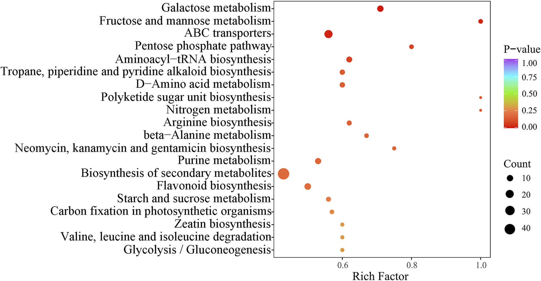 In this study, we performed KEGG enrichment analysis on the detected compounds. By integrating the analysis of the differential metabolites identified in both positive and negative ion modes, we were able to annotate and display the functions of these metabolites. A total of 70 metabolic pathways were integrated, covering 431 metabolites. The top 20 pathways were identified, with a particular focus on secondary metabolite biosynthesis, ABC transport, and galactose metabolism. These pathways enriched 49, 20, and 10 metabolites, respectively (Figures 7, 8).