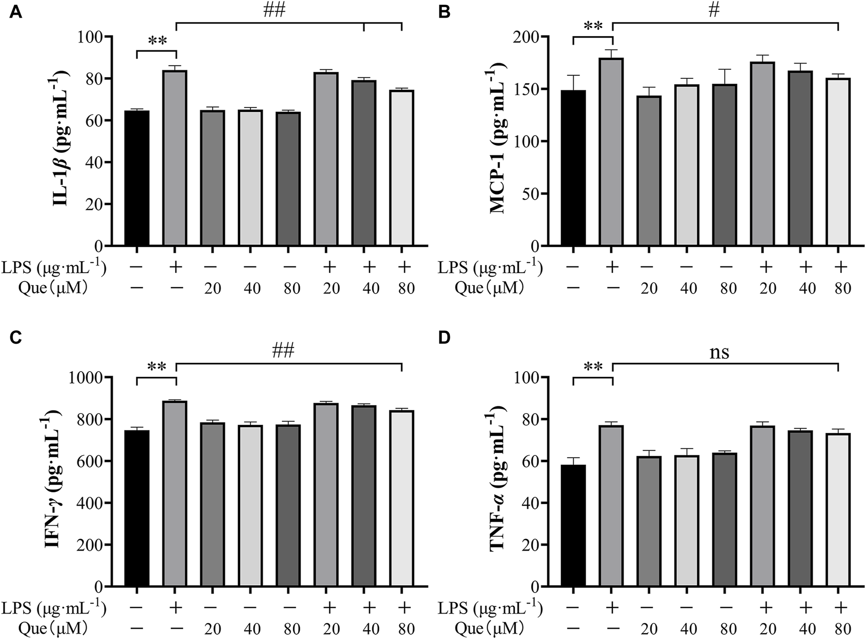 Figure 10. The pharmacological action of quercetin on TNF-α, IL-1β, IFN-γ and MCP-1 levels in LPS- induced HUVEC cells. (A) Amount of IL-1β in the supernatant of cells pretreated with quercetin. (B) Amount of MCP-1 in the supernatant of cells pretreated with quercetin. (C) Amount of IFN-γ in the supernatant of cells pretreated with quercetin. (D) Amount of TNF-α in the supernatant of cells pretreated with quercetin. Results were expressed as the average value ± SD. ##p < 0.01 indicates that it is different from the model group. *p < 0.05 and **p < 0.01, indicating that there is a significant difference with the control group.