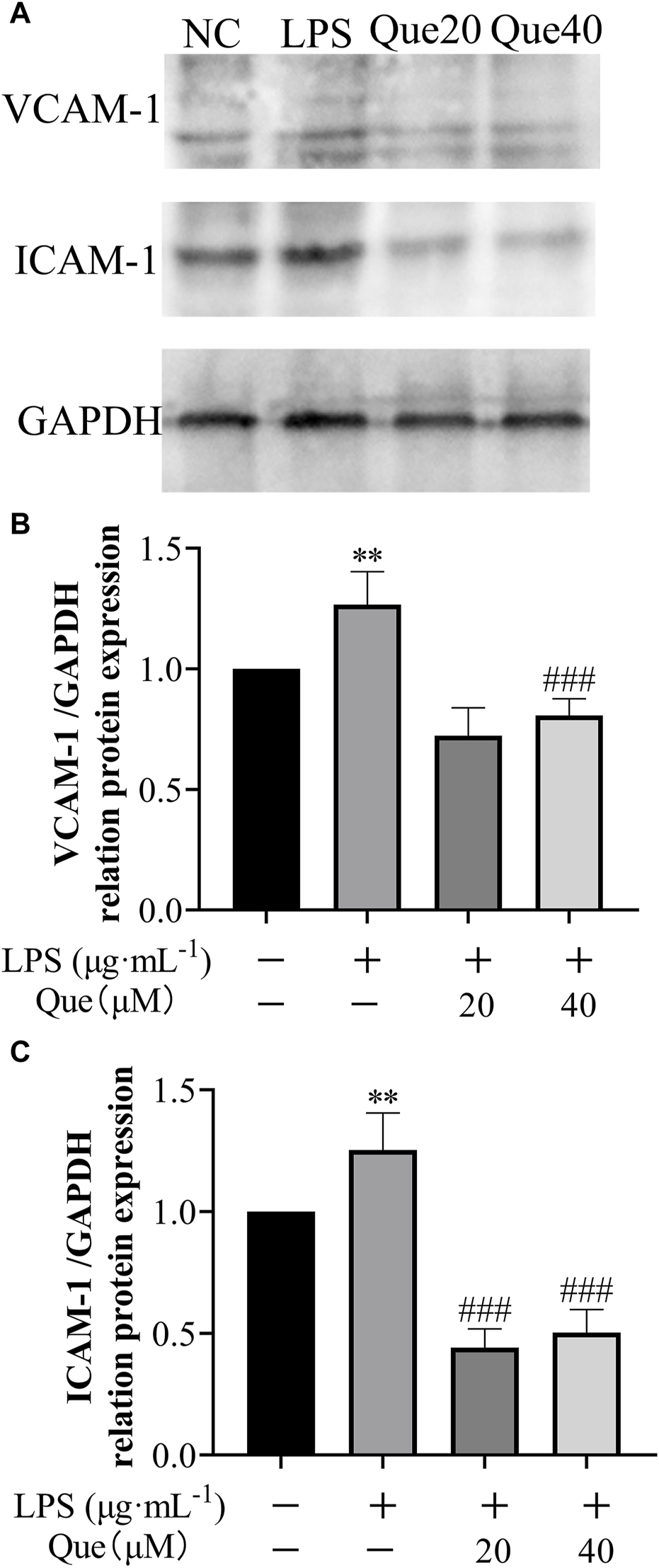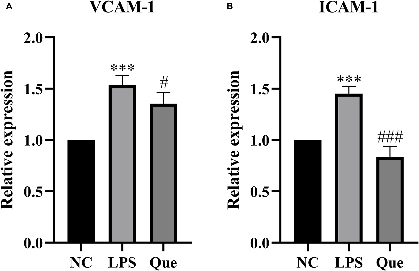 Furthermore, the effect of quercetin on the protein expression of ICAM-1 and VCAM-1 in HUVECs induced by LPS was examined (Figure 12). Following treatment with quercetin, the expressions of VCAM-1 and ICAM-1 proteins in the 20 μM (Que20) and 40 μM (Que40) groups showed significant differences compared to the model group (p < 0.001). This suggests that quercetin possesses the capability to suppress inflammation caused by LPS.