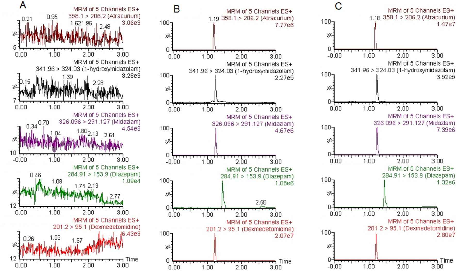 Representative chromatograms of ATC, DEX, MDZ, 1-OH-MDZ, and IS. (A) a blank plasma sample; (B) a blank plasma sample spiked with ATC, DEX, MDZ, 1-OH-MDZ, and IS; (C) a patient plasma sample.