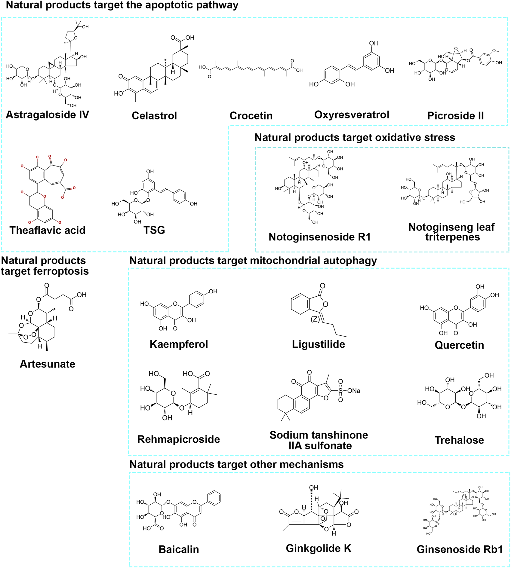 As we screen and summarize natural products that protect neurons through mitochondrial pathways, we have found ample evidence from in vitro and in vivo studies confirming their ability to target mitochondria and protect neurons. We have classified the pathways targeting mitochondria as follows: 1) targeting mitochondrial apoptosis pathway regulation; 2) targeting oxidative stress regulation of mitochondria; 3) targeting Ferroptosis regulation of mitochondria; 4) targeting mitophagy regulation of mitochondria; 5) other pathways. Please refer to Figure 2 and Table 1 for details.