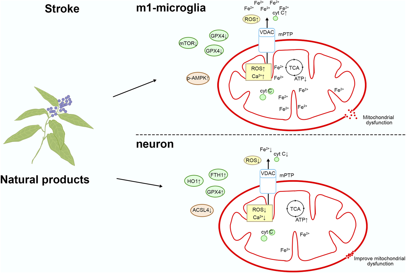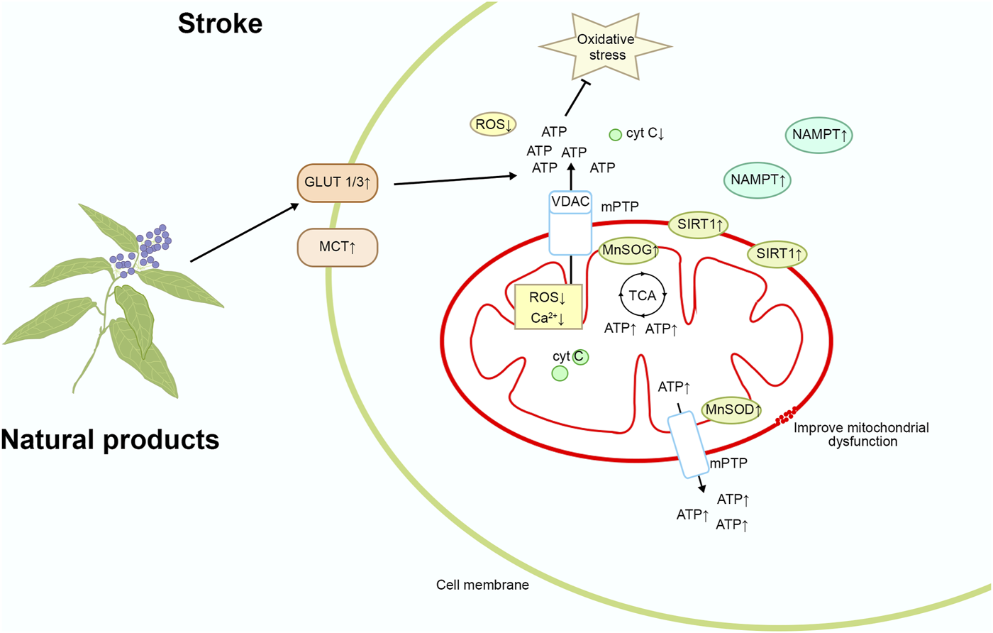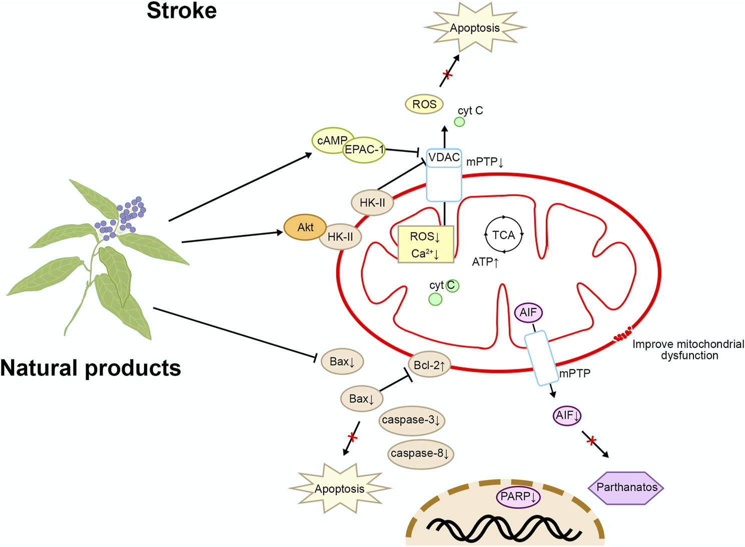 Numerous in vitro and in vivo studies have shown that natural products such as berberine, ginsenosides, and baicalein protect neuronal mitochondrial function and reduce stroke-induced damage through multiple mechanisms. These compounds reduce neuronal apoptosis by modulating the expression of mitochondrial-associated apoptotic proteins. They inhibit the activation of the mitochondrial permeability transition pore (mPTP), thereby decreasing ROS production and cytochrome C release, which helps preserve mitochondrial function. Additionally, they regulate ferroptosis, mitochondrial fission, and promote mitochondrial autophagy and trafficking, further enhancing neuronal protection.