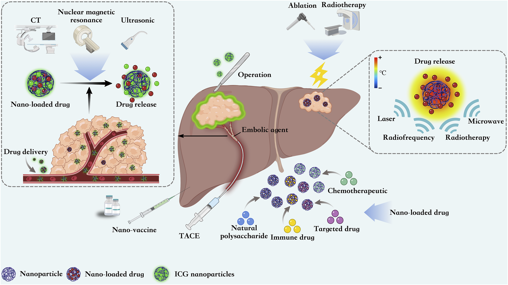 Nanoparticles are able to guide surgical resection of HCC by loading ICG contrast agents, They can also be loaded with chemotherapeutic agents as embolic agents for TACE. Nanoparticles focuses energy from external sources on the tumor site, thereby inducing local tumor destruction and improving ablation efficiency. At the same time, nanoparticles can also be loaded with chemotherapeutic, immunologic, and targeted drugs and natural polysaccharides for precise targeting of HCC. The development of multiple nanovaccines also offers new strategies for the treatment of HCC.