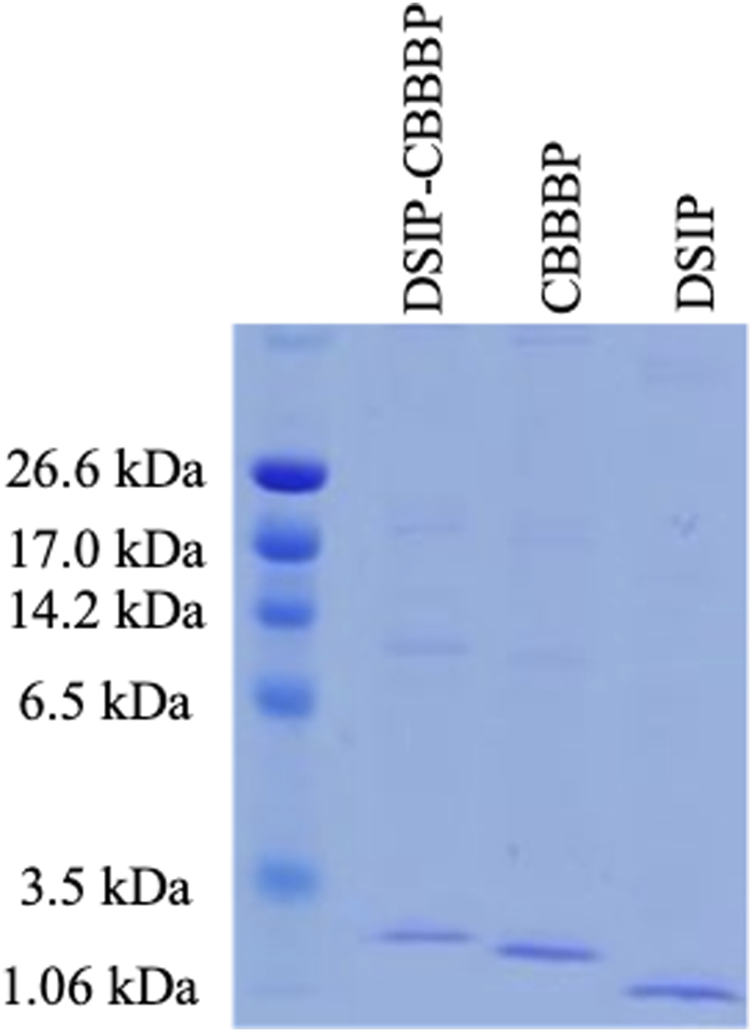 The expression of CBBBP, DSIP (Delta-Sleep Inducing Peptide) and fusion peptides DSIP-CBBBP in Pichia pastoris. The molecular weights of CBBBP, DSIP, and DSIP-CBBBP are 1.56 kDa, 0.88 kDa, and 2.71 kDa, respectively.