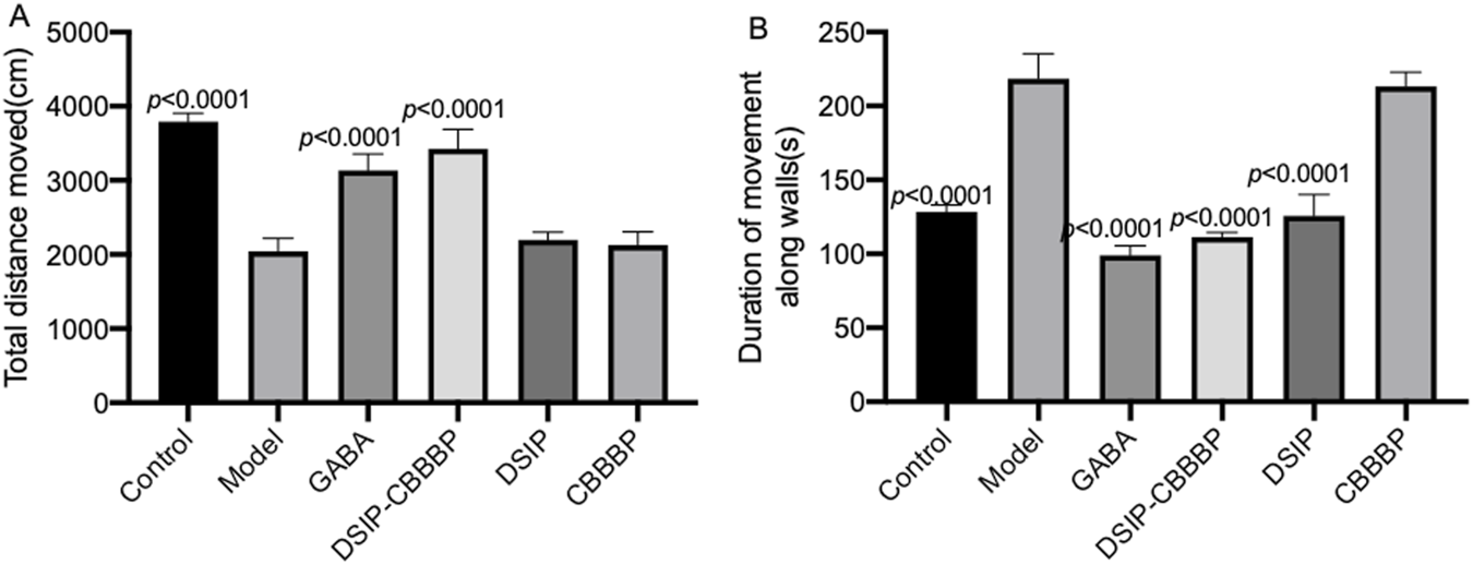 Figure 2 delineates the effects of different treatments on locomotor activity in mice within an insomnia model, as assessed by the open field test. The total distance moved (Figure 2A, F (5, 30) = 101.8, p < 0.0001) and the time spent moving (Figure 2B, F (5, 30) = 148.6, p < 0.0001) serve as indicators of exploratory behavior and general activity, with potential implications for anxiety or depressive-like states. In Figure 2A, the control group establishes the baseline level of activity, contrasted with the model group, which displays a significant decrease in movement, indicative of the behavioral suppression typical in insomnia (p < 0.0001). The administration of GABA is associated with an increased total distance moved (p < 0.0001), suggesting its effectiveness in counteracting the reduced mobility observed in the insomnia model. The DSIP-CBBBP and DSIP treatments show a statistically significant enhancement in the distance moved (p < 0.0001 for DSIP-CBBBP and DSIP), suggesting their potential in ameliorating the locomotor deficits associated with insomnia. CBBBP alone, while resulting in an increase in distance, does not have its p-value explicitly stated, thereby not clearly defining its statistical impact. Figure 2B complements these findings by showing the total time spent moving. The control group’s activity time is significantly higher than that of the model group, which shows a marked decrease (p < 0.0001), consistent with increased levels of anxiety or depression. Treatment with GABA significantly increases activity time (p < 0.0001), highlighting its anxiolytic properties. Similarly, DSIP-CBBBP and DSIP treatments induce significant increases in movement time (p < 0.0001 for both), indicating their potential in reducing depressive-like behaviors. CBBBP treatment also shows an increase in activity time, but like in Figure 2A, the absence of a p-value prevents a definitive assessment of its statistical significance.