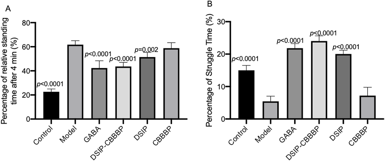 Figure 4 presents the outcomes of a tail suspension test used to assess depressive-like behaviors in an animal study. This test measures the duration of immobility and struggle time as indicators of depressive behaviors, with the premise that longer periods of immobility and shorter struggle times correlate with more severe depressive-like states. In Figure 4A (F (5, 30) = 106.4, p < 0.0001), the control group exhibits the expected baseline behavior with the lowest immobility percentage. The model indicates a significant increase in immobility time (p < 0.0001), suggesting the induction of an insomnia induced depressive-like state. The model treated with GABA, also shows a significant reduce in immobility when compared to the model group (p < 0.0001). DSIP-CBBBP presents a reduced immobility time when compared with the model group (p < 0.0001), implying the reduction of depressive-like behavior. DSIP but not CBBBP follow suit, demonstrates significant reduction in immobility (p = 0.002) and is indicative of reduced depressive-like behavior compared to the model but less than DSIP-CBBBP effects. Figure 4B captures the percentage of struggle time (F (5, 30) = 59.88, p < 0.0001), where the control has the highest struggle percentage, aligning with the least depressive-like behavior. The model shows a substantial reduction in struggle time (p < 0.0001), which is consistent with a depressive-like condition. GABA has a longer struggle time when compared with the model (p < 0.0001) as well, indicating a possible depressive effect. DSIP-CBBBP and DSIP exhibits an increase in struggle time when compared with model (p < 0.0001), suggesting that both treatments may influence depressive-like behaviors but not CBBBP alone.