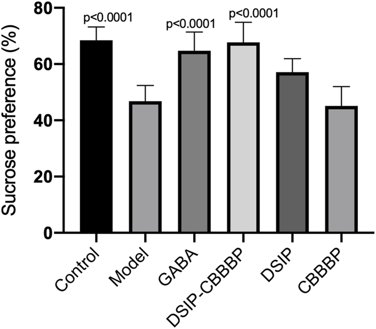 Figure 5 presents the effects of various peptide treatments on sucrose preference affected by PCPA in mice. The results show a significant overall effect across the different groups (F(5, 30) = 17.83 p < 0.0001). The control group shows expected baseline values, while the model group displays a marked reduction in sucrose preference (p < 0.0001). The treatments with DSIP and DSIP-CBBBP indicate a significant improvement compared to the model group, highlighting the potential therapeutic effects of these peptides on hedonistic behavior. Further analysis reveals that the DSIP-CBBBP group shows a notable improvement compared to both the model group and the DSIP-treated group, indicating that the fusion peptide may have enhanced efficacy and exerting its therapeutic effects (p < 0.0001). The CBBBP alone does not show as significant an effect, suggesting that while it aids in delivery, it is the DSIP component that is primarily responsible for the observed improvements in hedonistic behavior. Overall, the results demonstrate the effectiveness of DSIP and its fusion with CBBBP in mitigating PCPA-induced insomnia, offering promising insights into potential therapeutic applications for hedonistic behavior.