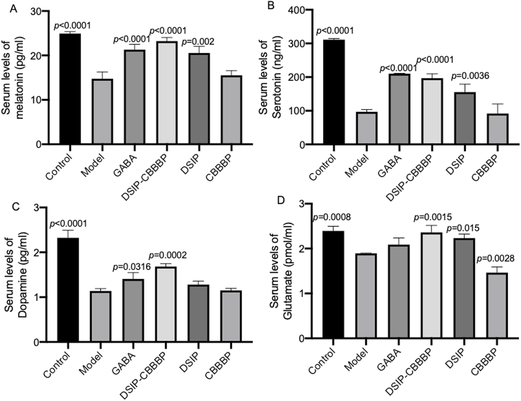 Different biochemical markers measured across various groups of mice. (A), serum levels of melatonin. (B), serum levels of serotonin. (C), serum levels of dopamine. (D), serum levels of glutamate. Control (healthy), Model (insomnia induced by PCPA), DSIP (treated with DSIP peptide), DSIP-CBBBP (treated with fusing peptides DSIP and CBBBP), and CBBBP. N = 6 for each group. The statistical difference is significant if p < 0.05 via the model group.