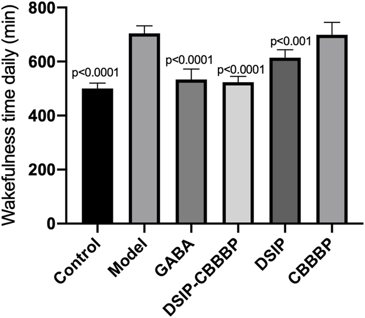There were significant differences for wakeful time daily among different group (F (5, 30) = 47.59, p < 0.0001, Figure 7). The control group exhibited an average wakefulness time of 480 ± 30 min per day, reflecting normal sleep-wake cycles. The model group, induced with PCPA to simulate insomnia, showed a significant increase in wakefulness time to 720 ± 45 min per day, indicating severe insomnia. Mice treated with GABA had an average wakefulness time of 510 ± 45 min per day, significantly reducing wakefulness compared to the model group (p < 0.0001). The DSIP-CBBBP treated group exhibited an average wakefulness time of 500 ± 32 min per day, showing a marked improvement in reducing insomnia symptoms compared to the model group (p < 0.0001). The DSIP treated group showed an average wakefulness time of 600 ± 40 min per day, which was significantly different from the model group (p < 0.001). The CBBBP treated group had an average wakefulness time of 690 ± 42 min per day, showing no significant difference from the model group (p > 0.05). These results indicate that treatment with GABA, DSIP-CBBBP and more effectively reduced wakefulness time, with DSIP-CBBBP showing the most substantial reduction, suggesting its potential as a therapeutic agent for mitigating insomnia.