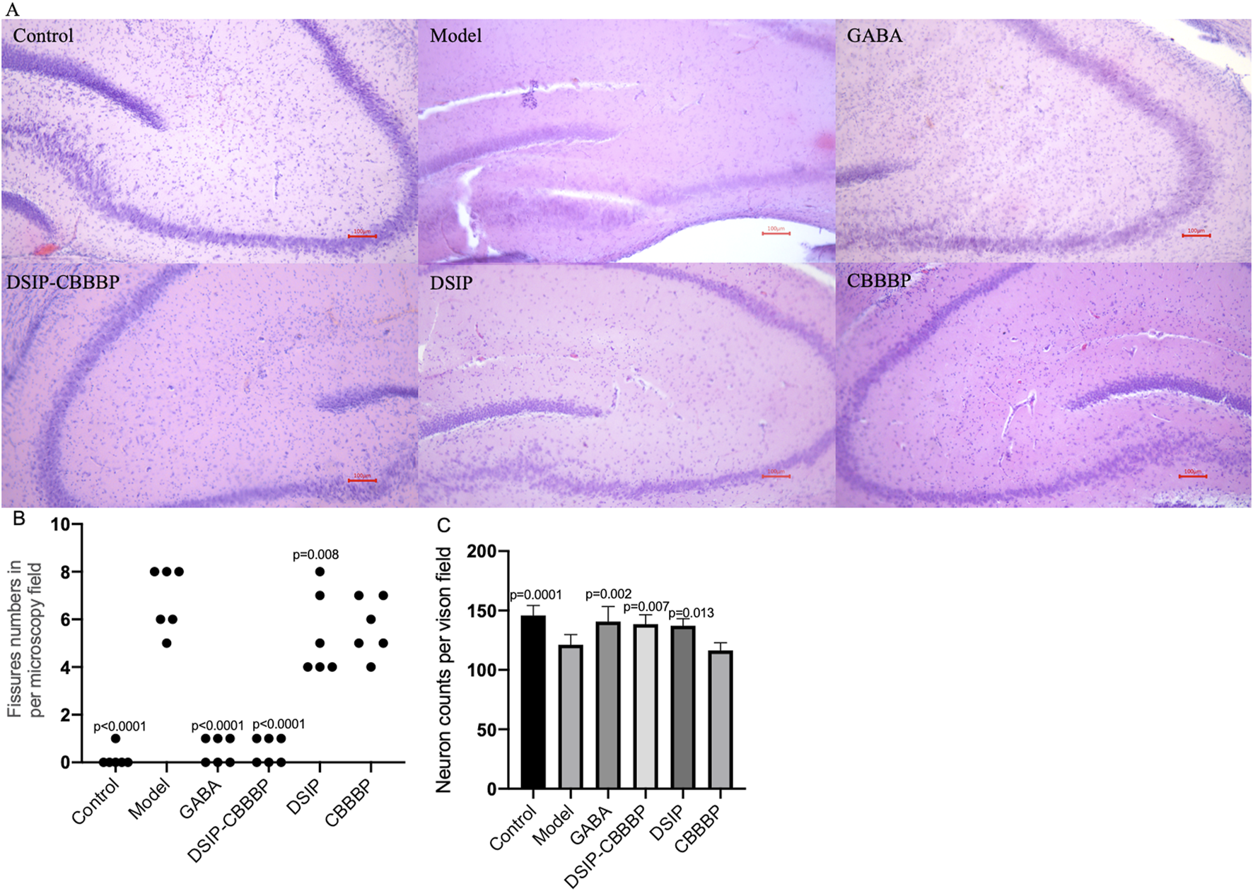 Brain tissue analysis. (A), Histological sections of a mouse brain stained with hematoxylin and eosin (H&E). (B), the fissure numbers in different groups. (C), the neuron density in different groups. Control, healthy mice. Model, insomnia mice induced by PCPA. The model mice treated with GABA, DSIP, CBBBP and DSIP-CBBBP fusion peptides. N = 6 for each group. The statistical difference is significant if p < 0.05 via the model group.