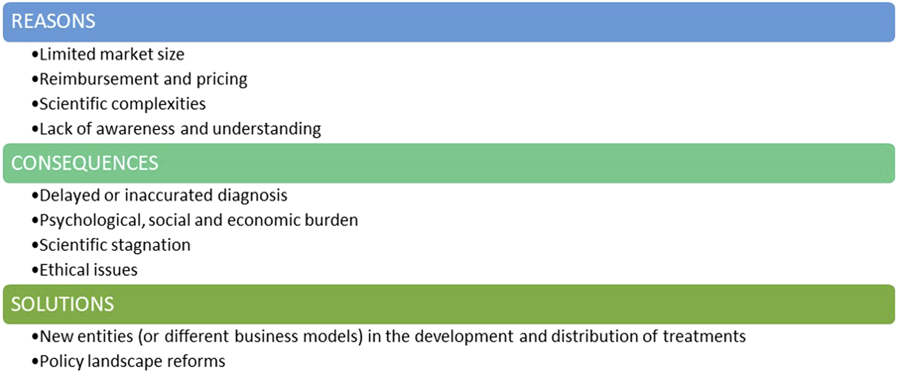 ∙ Reimbursement and pricing can be a significant barrier. Even when a RD treatment reaches the market, challenges persist in terms of market access and pricing. Setting a fair price for RD’s treatment is an activity to be weighed carefully: on one hand, pharmaceutical companies need to cover development costs and generate revenue to payback investors and sustain further research, whilst on the other hand, high prices can raise ethical concerns and limit patient access, especially when healthcare systems face budget constraints. Uncertainty in the likely acceptable price-point and potential for return on investment can discourage initial investment and acceptance of the development risks.