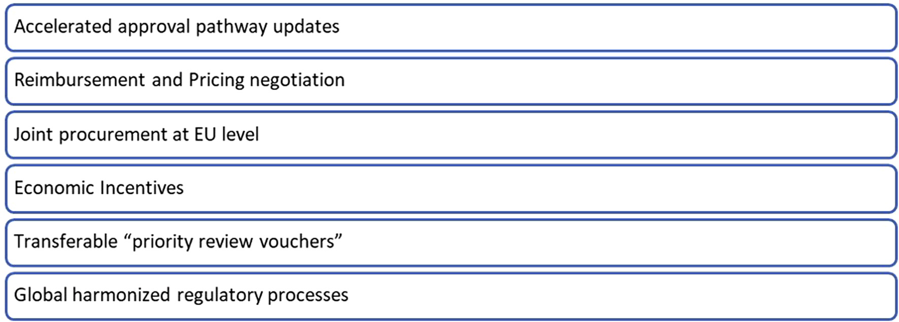 ∙ Transferable “priority review vouchers” or analogous incentives, similar to the FDA Priority Review Voucher schemes, should be implemented within the EU framework for medicines addressing high unmet medical needs. This approach based on a “tradable” reward system for developers who manage to complete the registration of a product addressing high unmet medical needs could allow leveraging private “for-profit” funding to enhance the return on investment on “less profitable” products. In addition to revenue derived from product sales, such ventures could benefit from an additional one-off bonus income through the sale of these vouchers.