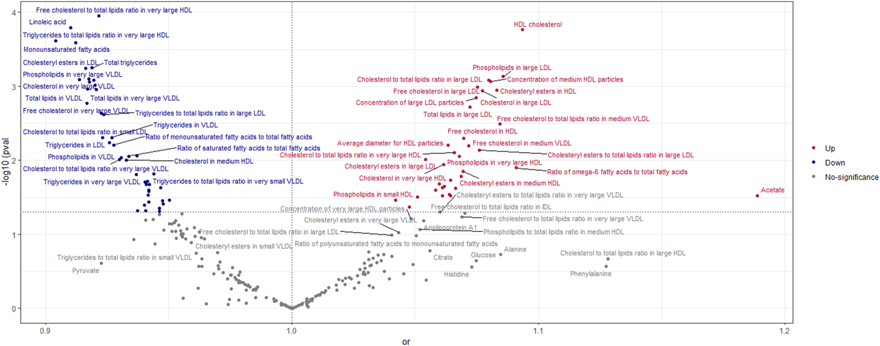 Summary-level datasets on 249 circulating metabolites (acetate, acetone, alanine, albumin, apolipoprotein A1/B, cholines, citrate, docosahexaenoic acid, creatinine, glutamine, glycine, HDL cholesterol, LDL cholesterol, cholesterol, histidine, isoleucine, linoleic acid, lactate, omega-3 fatty acids, omega-6 fatty acids, There were 115,078 randomly chosen participants in this study. High-throughput nuclear magnetic resonance (NMR) evaluated metabolic indicators in non-fasting baseline EDTA plasma samples (https://biobank.ndph.ox.ac.uk/ukb/label.cgi?id=220). The indicators contain 168 metabolites (unit, mmol/L) and 81 metabolite proportions, spanning numerous metabolism pathways, including lipoproteins, fatty acids, amino acids, and ketone bodies.