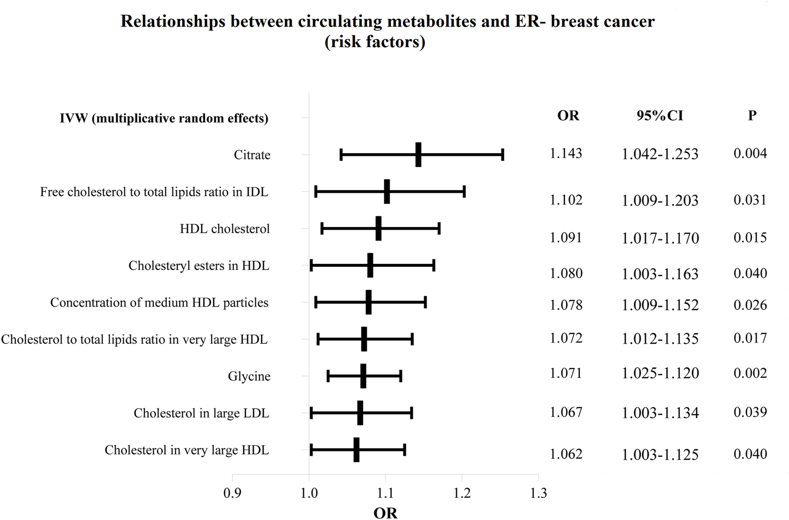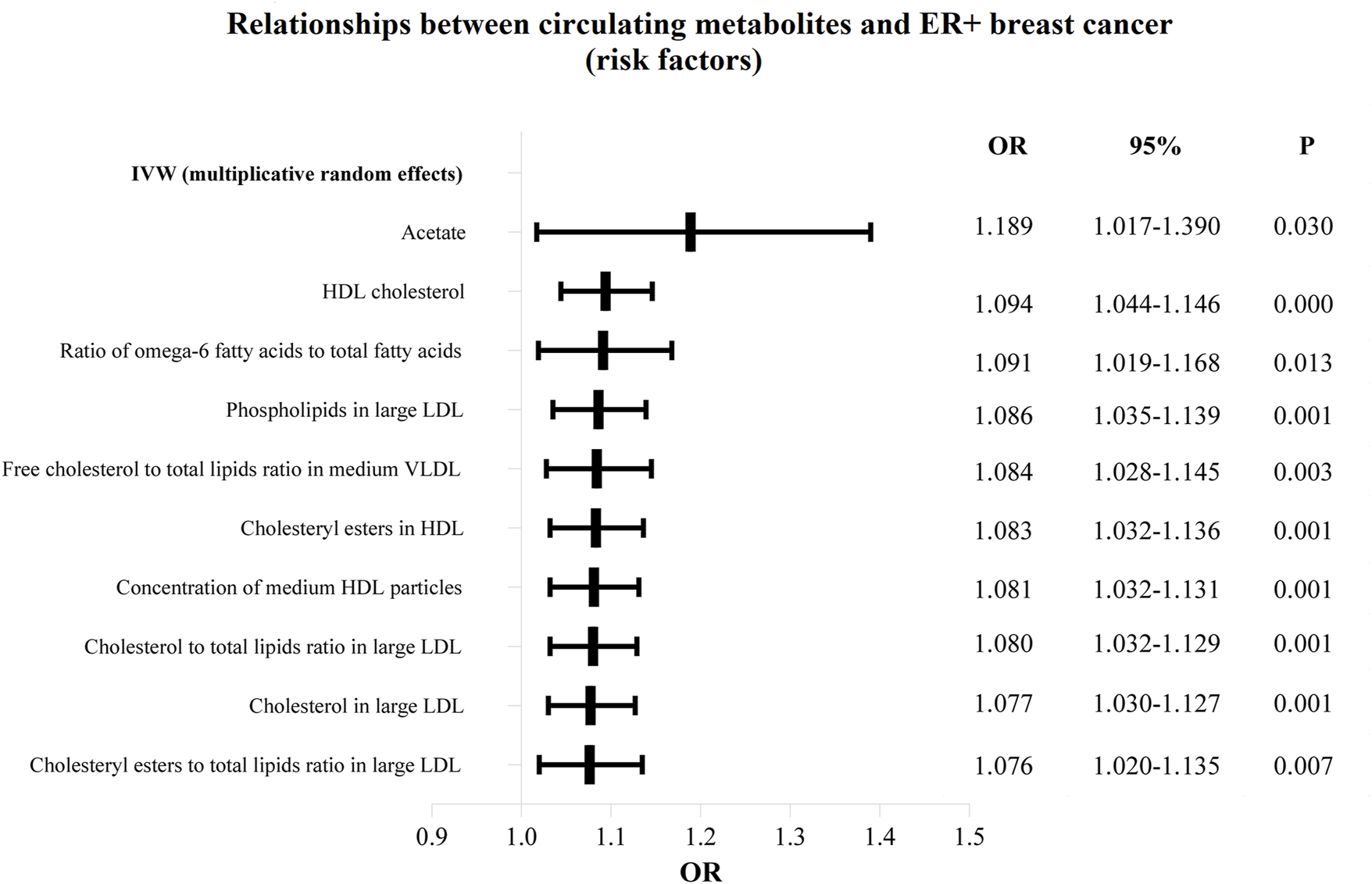 The IVW analysis revealed significant causal relationships between 79 circulating metabolites and ER + breast cancer risk, and 10 metabolites were significantly associated with ER-breast cancer risk. Notably, acetate (OR = 1.12, P = 0.03), HDL cholesterol (OR = 1.09, P < 0.001), ration of omega-6 fatty acids to total fatty acids ratio (OR = 1.09, P = 0.01), and phospholipids in large LDL (OR = 1.09, P < 0.001) were linked to an increased risk of ER + breast cancer, while linoleic acid (OR = 0.91, P < 0.001) monounsaturated fatty acids (OR = 0.91, P < 0.001), and total lipids in LDL (OR = 0.91, P < 0.001) were associated with a decreased risk. In ER-breast cancer, glycine, citrate, HDL cholesterol, cholesteryl esters in HDL, cholesterol to total lipids ratio in very large HDL, and cholesterol in large LDL were associated with an increased risk, while the free cholesterol to total lipids in very large HDL was linked to a decreased risk.