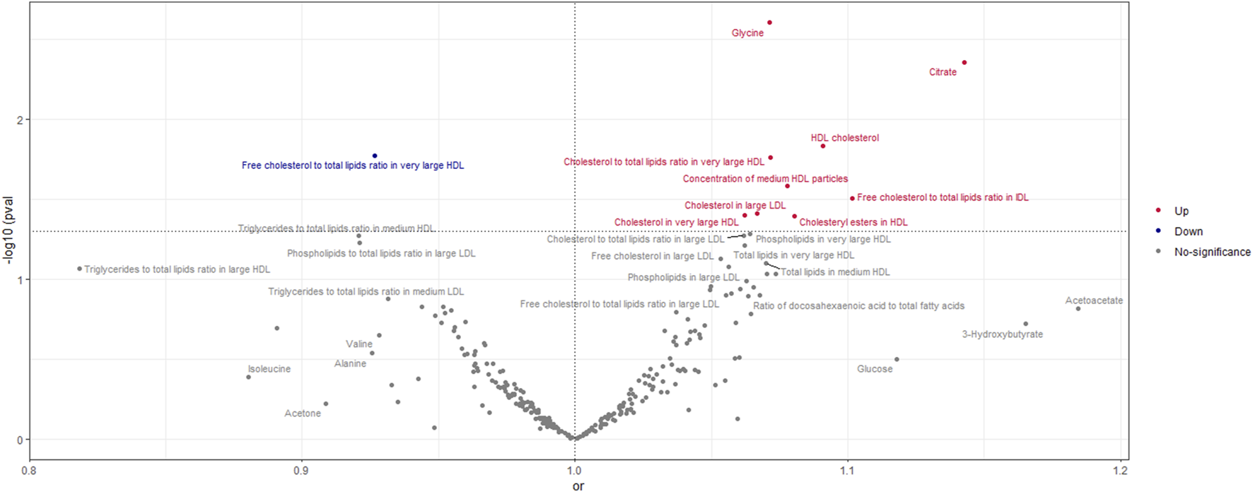 Volcano Plot visualizing the result of IVW in negative breast cancer. The red dots present circulating metabolites increasing the risk of negative breast cancer. The blue dots are circulating metabolites with protective effects on negative breast cancer. The grey dots indicate circulating metabolite without a causal impact on negative breast cancer.