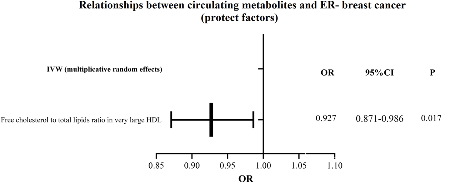 Additionally, as shown in Figures 6, 7, we eliminated circulating metabolites with a substantial increase or decrease in risk for ER-breast cancer (p = 0.05), sorted them according to OR values, and then displayed them as a forest plot. Citrate (OR = 1.143, 95%CI = 1.042–1.253, p = 0.004), Free cholesterol to total lipids ratio in IDL (OR = 1.102, 95%CI = 1.009–1.203, p = 0.031), HDL cholesterol (OR = 1.091, 95%CI = 1.017–1.170, p = 0.015), Cholesteryl esters in HDL (OR = 1.080, 95%CI = 1.003–1.163, p = 0.040). Supplementary Table S6 displays the specific causative relationships between each genetic variation of each circulating metabolite and ER-breast cancer as determined by different MR analysis techniques.