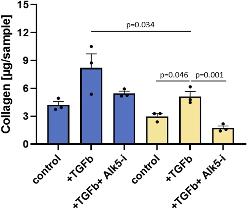Silencing RNA (siRNA) targeting EP300 shows a significant (p-value < 0.05) reduction in fibrosis. Total collagen levels measured in primary hepatic stellate cells (HSCs) in the presence of siRNA targeting either eGFP (blue, control siRNA) or EP300 (yellow). Aside from the untreated controls, the cells were stimulated with TGFβ (+TGFβ) in the absence or presence of the ALK5 inhibitor (+TGFβ+Alk5-i). The data are presented as mean ± SD (n = 3).