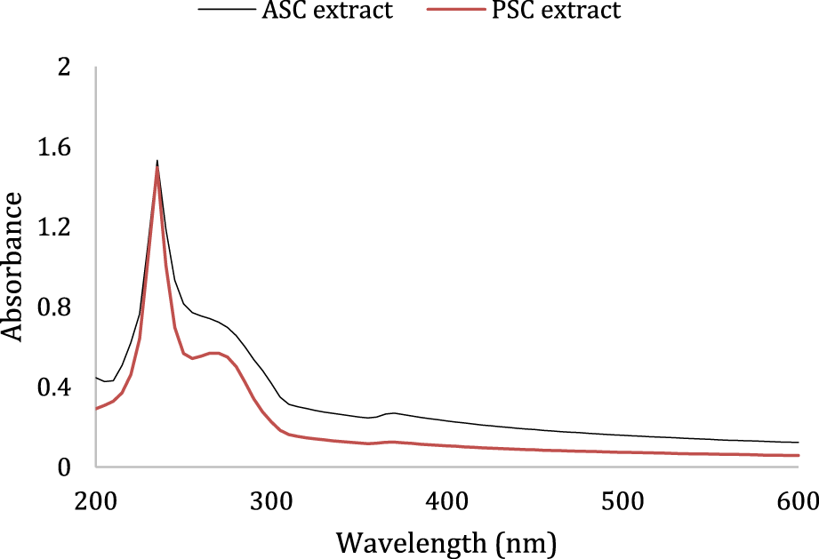 The UV-Vis analyses of ASC and PSC extracts (1 mg/mL) were conducted following the procedure outlined by Srinivasan and Durairaj (2021).