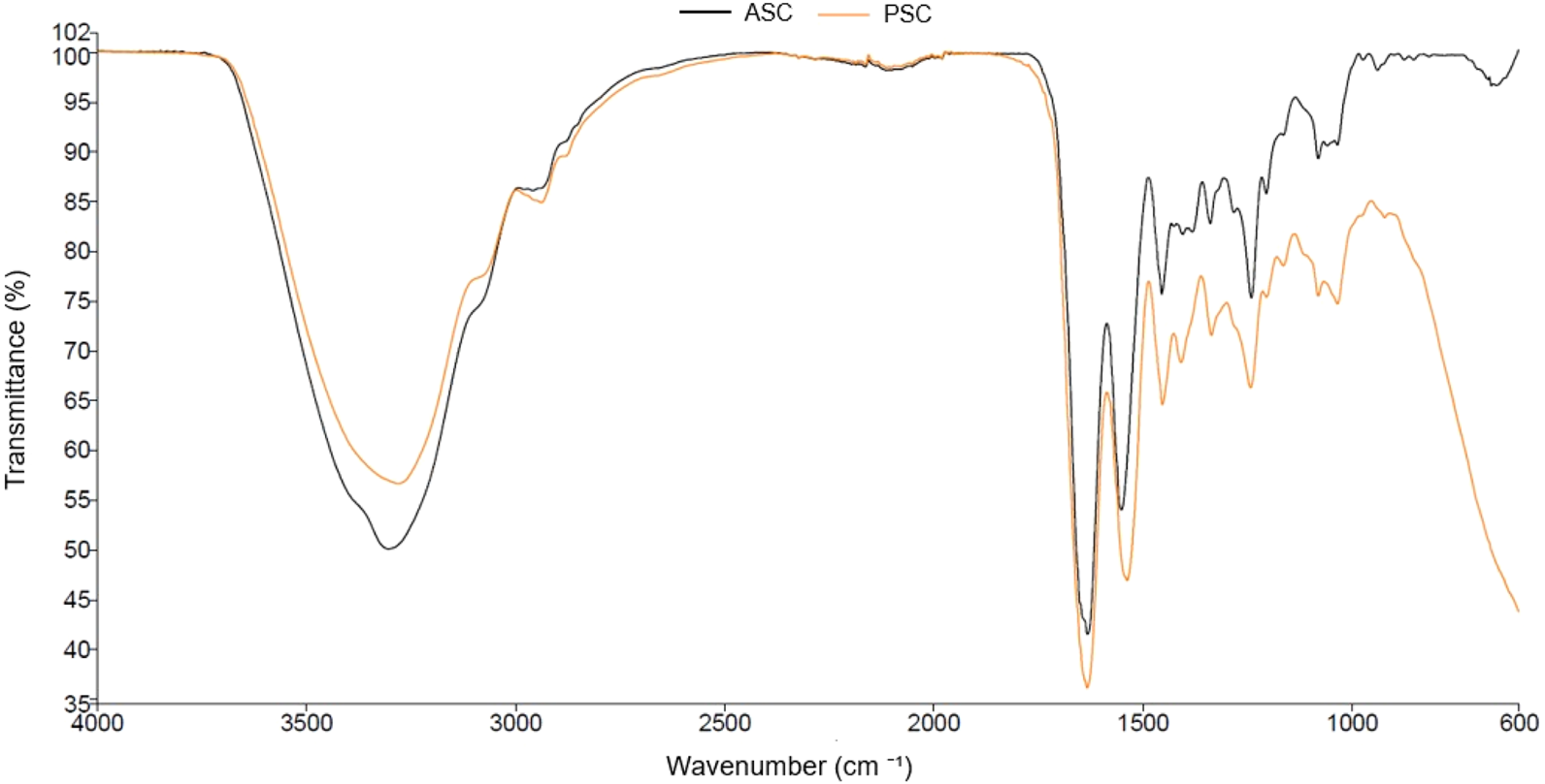 Figure 2. FTIR spectra of ASC (acid soluble collagen) and PSC (pepsin soluble collagen) freeze-dried extracts.