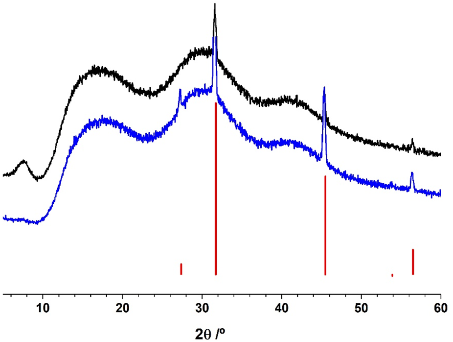 Also in both samples, NaCl is detected (sharp peaks identified in Figure 3), and its identification was made recurring to the Crystallography Open Database. The PSC extract contains a higher amount of NaCl than ASC extract.