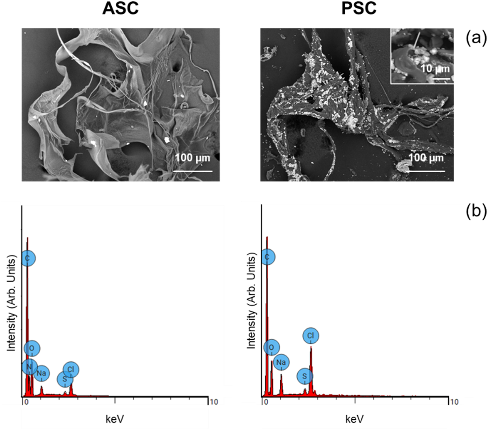 Figure 4. Physicochemical characterization of ASC (acid soluble collagen) and PSC (pepsin soluble collagen) extracts derived from Sardina pilchardus scales; (A) scanning electron microscopy (SEM) images, with the insert showing detailed PSC morphology, and (B) energy-dispersive X-ray spectroscopy (EDS) spectra.