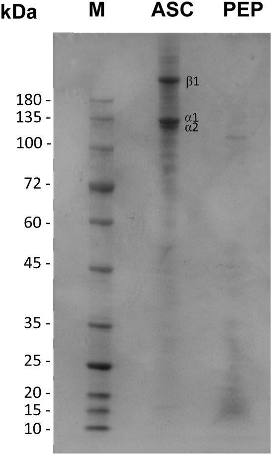 Figure 5. SDS-PAGE of collagen (ASC) and collagen peptides (PEP). Protein markers are depicted as M.