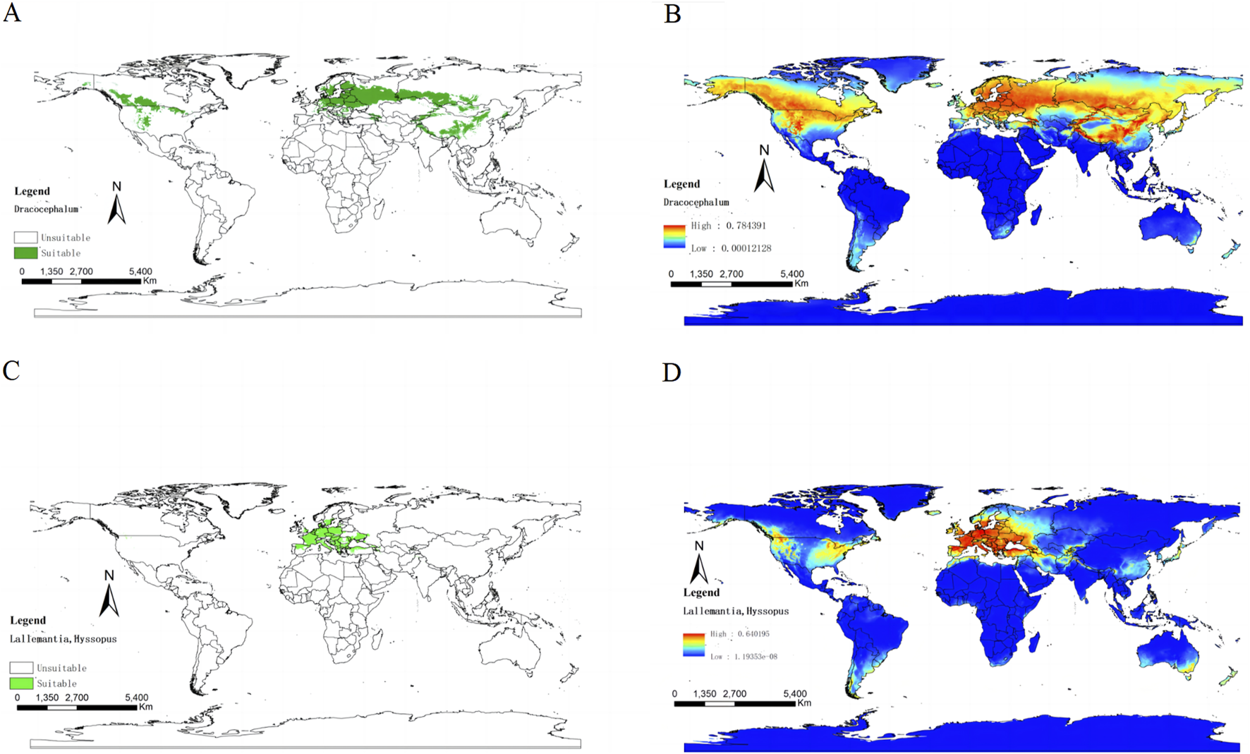 Ecologically suitable regions of genus Dracocephalum (Green distribution is suitable for the growth area of Dracocephalum). (A). Suitability distribution of Dracocephalum. From blue to red, the suitability of Dracocephalum gradually increases, and yellow is the transition area (B). Ecologically suitable regions of genus Lallemantia and Hyssopus (Green distribution is suitable for the growth area of Lallemantia and Hyssopus). (C). Suitability distribution of Lallemantia and Hyssopus. From blue to red, the suitability of Lallemantia and Hyssopus gradually increases, and yellow is the transition area (D).