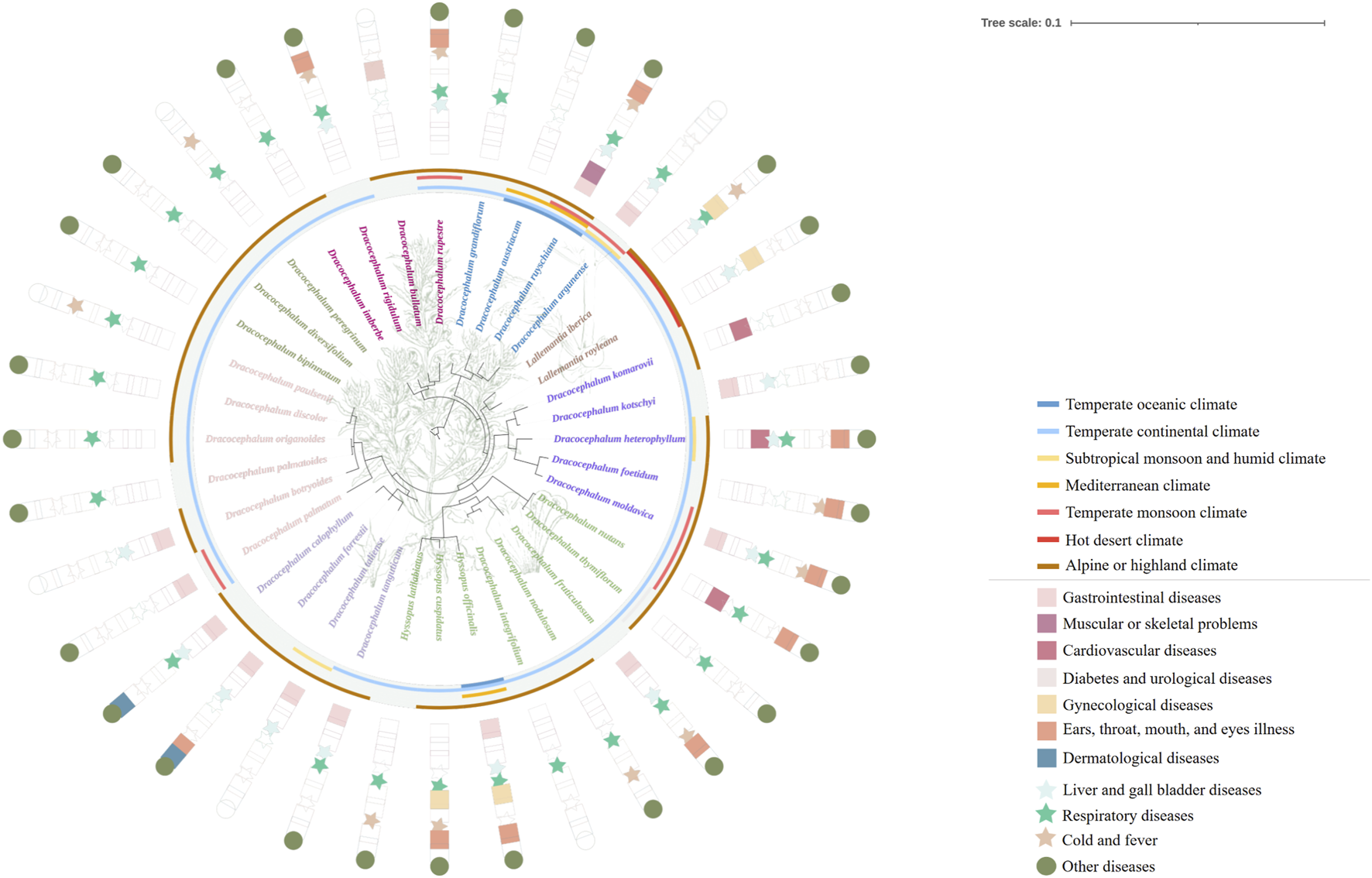 This refined phylogenetic tree expands upon the original framework constructed by Chen et al., with selective pruning to emphasize species of Dracocephalum and its closely related genera, recognized for their medicinal properties and historical use in healing practices. The outermost ring of the visualisation encapsulates the climatic distribution characteristics of these plants, collated from the World Plants database [https://www.worldplants.de/world-plants-complete-list/complete-plant-list] and the iPlant database [http://www.iplant.cn/]. The annotations on the outer layer provide insights into the medicinal efficacy attributed to these species, offering a visual representation of their therapeutic potential. The traditional classification of efficacy is shown in Supplementary Table S2, and the climate information of each region is shown in Supplementary Table S5.