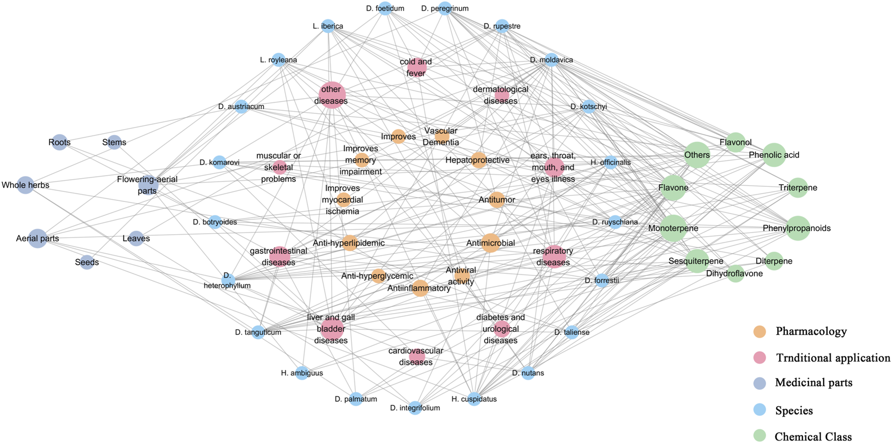 Network analysis of genus Dracocephalum-chemical metabolites-traditional application and pharmacological activities. (We used Microsoft Excel 2010 software for statistical analysis and Cytoscape 3.7.2 software for visual presentation and established a network diagram. Nodes represent medicinal plants, chemical metabolites, traditional applications, and medicinal parts of Dracocephalum, and edges are connected to represent their mutual relationship; Connectivity indicates the number of edges directly associated with a node in the network diagram. The greater the connectivity, the wider the network of the node.