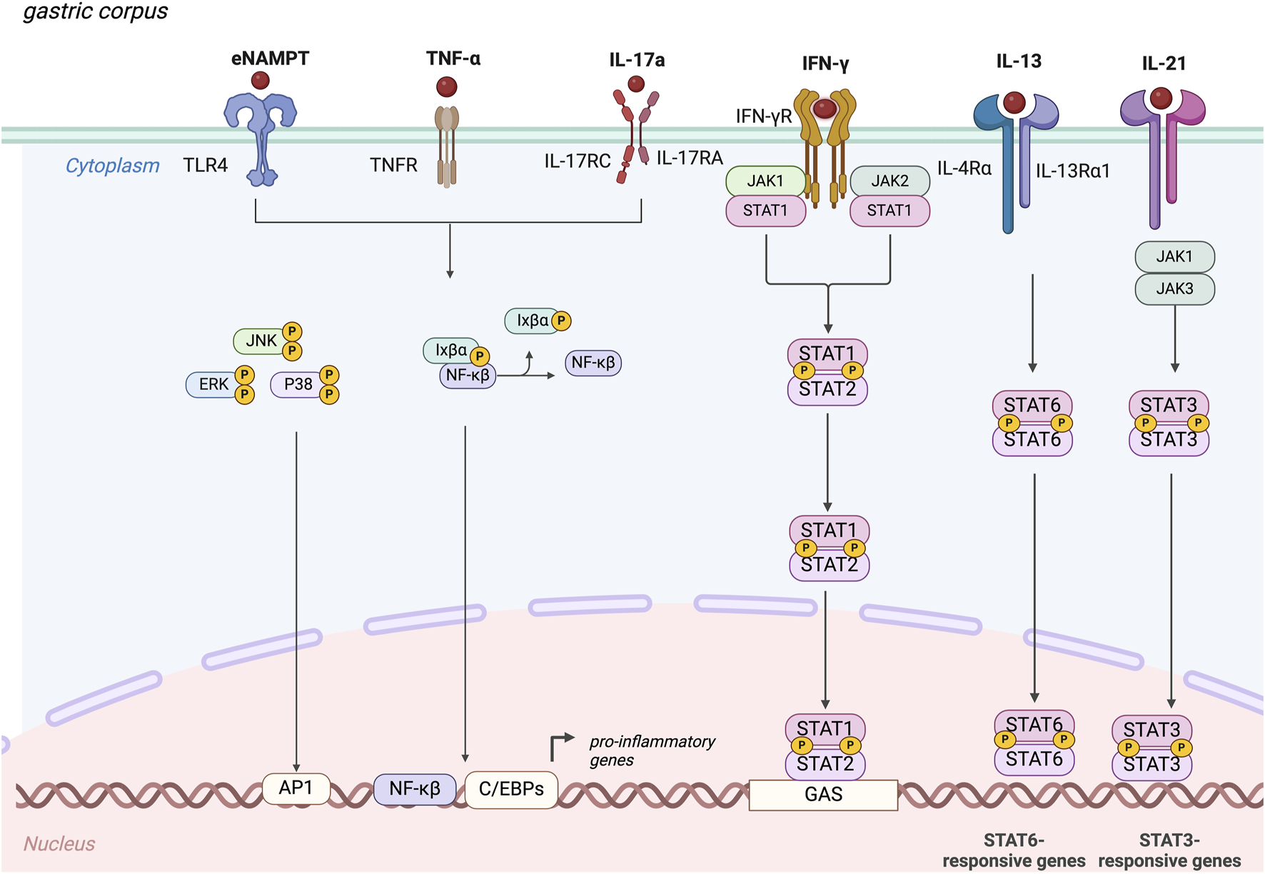 Molecular mechanisms elicit by the main pejorative cytokines involved in autoimmune gastritis. IFNγ, interferon-gamma; TNF-α, Tumor Necrosis Factor-α; IL-21, Interleukin-21; IL-13, Interleukin-13; IL-17A, Interleukin-17A; eNAMPT, extracellular nicotinamide phosphoribosyl transferase, JAK, Janus kinase; JNK, c-Jun N-terminal kinases; ERK, Extracellular signal-regulated kinases; P38, mitogen-activated protein kinases; NF-κB, nuclear factor kappa-light-chain-enhancer of activated B cells; STAT, Signal transducer and activator of transcription.