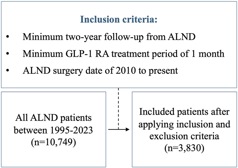 We reviewed all consecutive ALND cases from 1995 to 2023 at Memorial Sloan Kettering Cancer Center (MSKCC). The study was approved by the Institutional Review Board (IRB #18-177). The assessed independent variables included: GLP-1 RA use, race, preoperative BMI, chemotherapy, radiation, and diabetes. We then applied the following criteria (Figure 1): 1) minimum 2-year follow-up from the time of ALND, 2) Minimum GLP-1 RA treatment period of 1 month, and 3) ALND surgery date of 2010 to present. This last constraint was applied to limit lead-time bias, resulting in a similar mean follow-up time for both the GLP-1 RA group and the non-GLP-1 RA cohort. All patients in the GLP-1 RA group had to have either been on the drug at the time or following ALND. Patients who stopped taking GLP-1 RAs prior to ALND and those diagnosed with lymphedema prior to starting GLP-1 RA treatment were excluded from the study. International classification of diseases (ICD) codes I97.2, I98.0, 457, 457.1 were used to identify patients who developed lymphedema.
