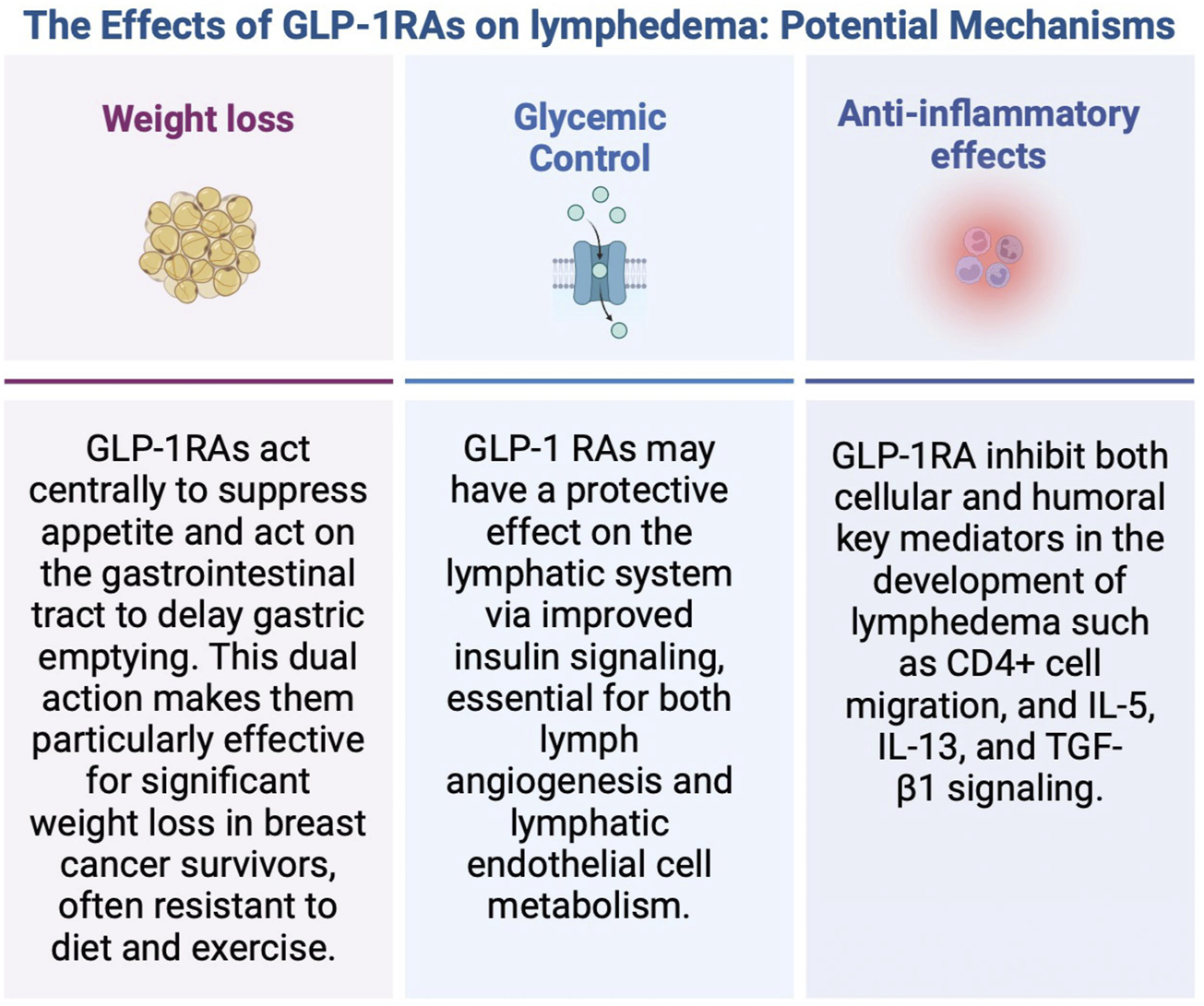 In addition to weight loss and glucose control, GLP-1 RAs affect both immunologic and inflammatory pathways which may have a direct and positive effect on lymphatic function (Park et al., 2024; Alharbi, 2024; Bendotti et al., 2022/08; Farr et al., 2016; Chen et al., 2022; Mehdi et al., 2023). The pathophysiology of lymphedema is complex and includes features of a dysregulated immune response leading to chronic inflammation, lymphatic dysfunction, and fibrofatty proliferation. It has been established that activated CD4+ T cells and differentiation into T-helper 2 (Th2) cells are at the front end of this process (Avraham et al., 2013; Ly et al., 2019). Downstream production of pro-inflammatory cytokines such as interleukin-4 (IL-4), interleukin-5 (IL-5), and interleukin-13 (IL-13) contribute to chronic inflammation and fibrosis (Brown et al., 2023a). GLP-1 RAs have been shown to inhibit chemokine-related migration of human CD4+ lymphocytes (Liberman et al., 2013). Additionally, GLP-1RAs have demonstrated efficacy in reducing allergic responses in asthma by inhibiting the activation of the NF-kB pathway. This inhibition leads to decreased numbers and reduced migration of CD4+ T cells, as well as a reduction in the release of IL-5 and IL-13 (Toki et al., 2021; Wu and Peebles, 2021). Liraglutide was also shown to mitigate fibrosis in mice through the downregulation of NF-kB signaling and the decrease in levels of TGF-β1, a key regulator of fibrosis in cancer-related lymphedema (Gou et al., 2014; Baik et al., 2022; Kataru et al., 2019). These anti-inflammatory and immunologic effects of GLP-1 RAs are of interest as weight loss alone may not be the only therapeutic mechanism as it relates to lymphedema.