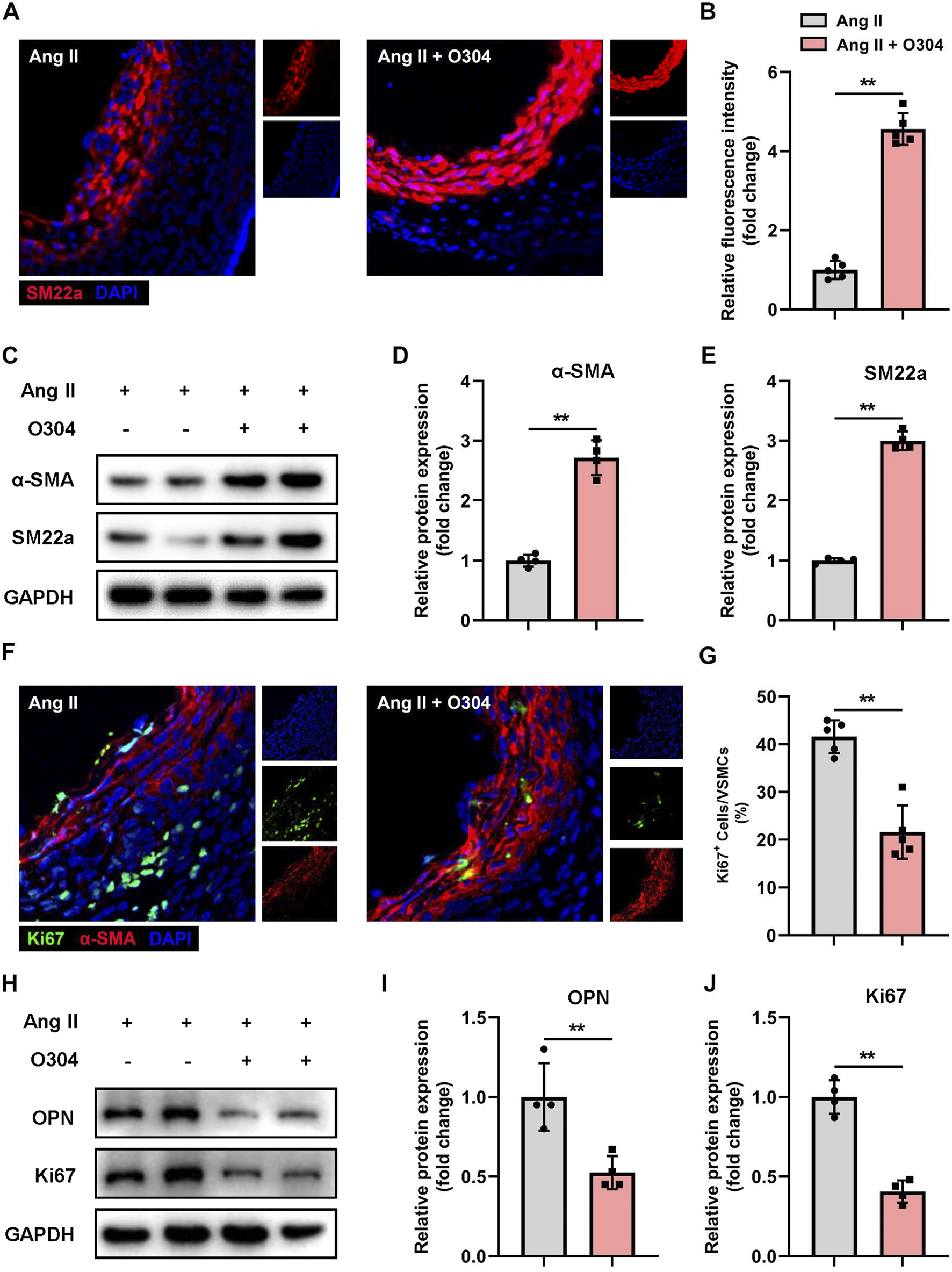 O304 suppressed VSMC phenotypic switching in the mouse model of angiotensin II-induced AAA. The mice were divided into the angiotensin II and angiotensin II + O304 groups. The frozen sections of AAA tissues were collected on day 28 after surgery for further analysis. (A) SM22a expression in AAA tissues was detected via immunofluorescence staining. (B) Quantification of contractile VSMCs. (C–E) Western blotting was performed to assess the protein expression of α-SMA and SM22a. (C) Representative immunoblots. Full-length blots were presented in Supplementary Figure S3. Quantification of (D) α-SMA and (E) SM22a protein via densitometry analysis and normalization to GAPDH. (F) AAA tissue samples were stained with anti-α-SMA antibody to identify contractile VSMCs, anti-Ki67 to identify synthetic (proliferative) VSMCs, and DAPI to identify the nuclei. (G) Quantification of Ki67+ contractile VSMCs. (H–J) Western blotting was performed to assess the protein expression of OPN and Ki67. (H) Representative immunoblots. Full-length blots were presented in Supplementary Figure S4. Quantification of (I) OPN protein expression and (J) Ki67 protein expression via densitometry analysis and normalization to GAPDH. n = 4 independent experiments. Significance was evaluated via the Student’s t-test in (B, D, E, G, I, J). *p < 0.05 and **p < 0.01. AAA, abdominal aortic aneurysm; α-SMA, α-smooth muscle actin; GAPDH, glyceraldehyde-3-phosphate dehydrogenase; VSMC, vascular smooth muscle cell; SBP, Systolic blood pressure; DBP, Diastolic blood pressure.