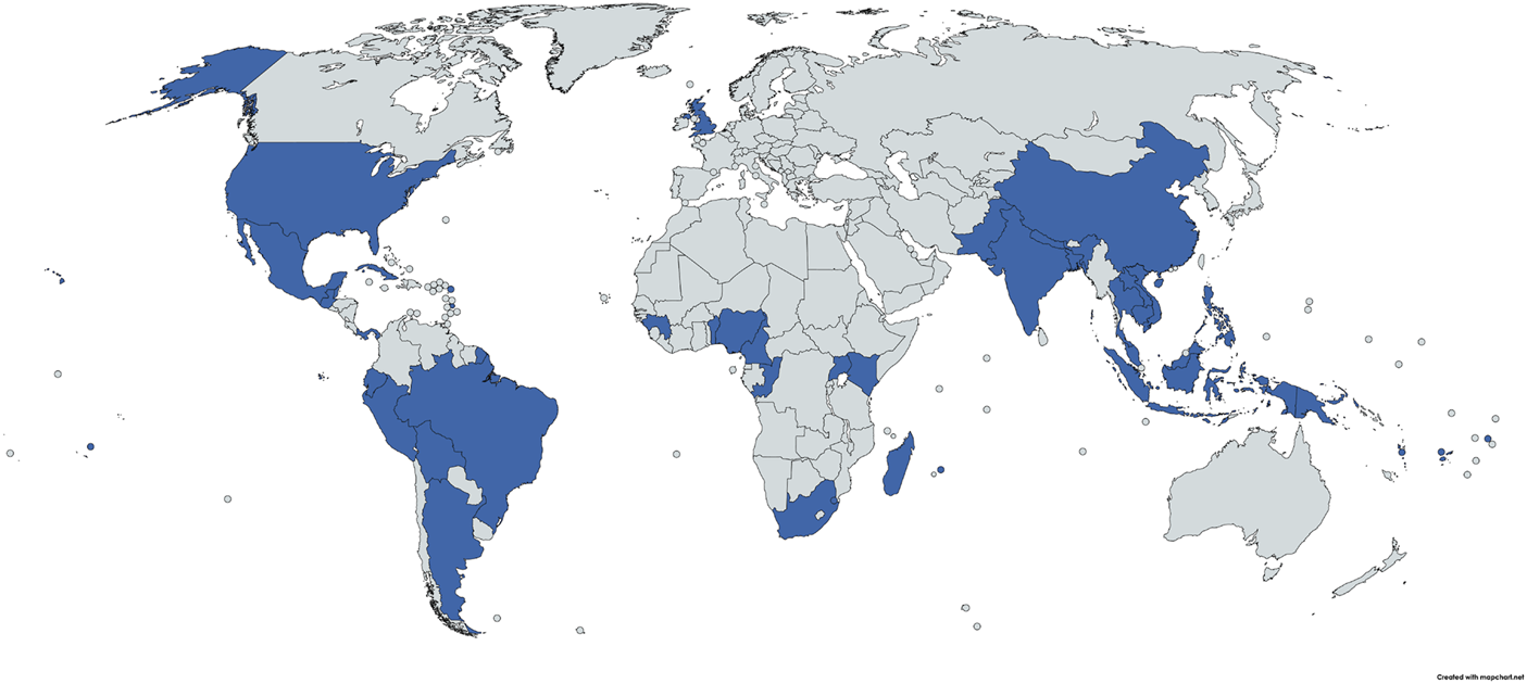 Map showing (in blue) the countries where Psidium guajava is used for treating diarrhea (created with mapchart.net).