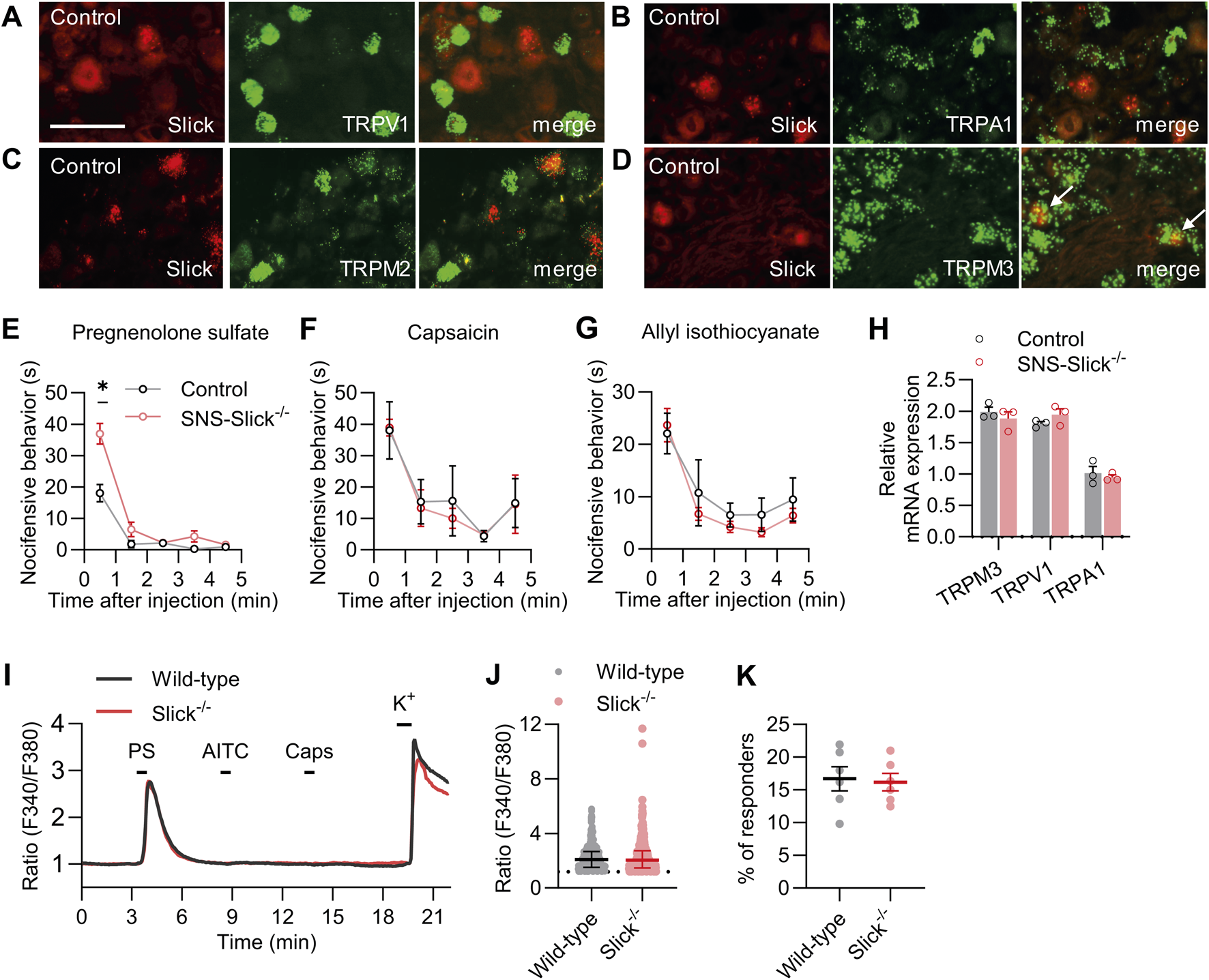 Slick is involved in transient receptor potential melastatin 3 (TRPM3) activation-induced nocifensive behavior. (A–D) Double in situ hybridization of Slick and TRPV1(A), TRPA1(B), TRPM2(C), and TRPM3(D) mRNAs in the DRGs of control mice. Colocalization of Slick and TRPM3 is indicated by the white arrows. (E) SNS-Slick−/− mice showed enhanced nocifensive behaviors in the first minute after the intraplantar injection of pregnenolone sulfate [PS; p = 0.004; SNS-Slick−/−: n = 8 (4 females and 4 males); control: n = 8 (4 females and 4 males)]. (F, G) Nocifensive behaviors of SNS-Slick−/− mice were unaltered after the intraplantar injection of capsaicin (F; SNS-Slick−/−: n = 5 [2 females and 3 males]; control: n = 5 [2 females and 3 males]) or allyl isothiocyanate (G; AITC; SNS-Slick−/−: n = 8 [5 females and 3 males]; control: n = 8 [5 females and 3 males]). (H) qRT-PCR analyses revealed that TRPM3 (p = 0.458), TRPV1 (p = 0.250), and TRPA1 mRNA (p = 0.610) levels are similar in the DRGs of SNS-Slick−/− (n = 3 [2 females and 1 male]) and littermate control (n = 3 [2 females and 1 male]) mice. (I) Representative examples of Fura-2-ratiometric calcium traces in sensory neurons of wild-type and Slick−/− mice that reacted to a stimulation with PS and KCl, but not with capsaicin or AITC. (J) Ratio of the calcium response to PS stimulation in sensory neurons from wild-type (n = 495 neurons in 6 mice [3 females and 3 males]) and Slick−/− mice (n = 460 neurons in 6 mice [3 females and 3 males]). p = 0.505. (K) Percentage of sensory neurons from wild-type and Slick−/− mice that responded to the PS stimulation, but not to the AITC or capsaicin stimulation (n = 6 mice [Slick−/−: 3 females and 3 males; WT: 3 females and 3 males]). p = 0.821. Scale bar: 50 μm *p < 0.05. In (E–G), two-way repeated-measures analysis of variance with Sidak’s multiple comparison test was used. In (H), multiple unpaired t-test was used. In (J, K), unpaired t-test was used. Data are presented as means ± standard errors of the mean.
