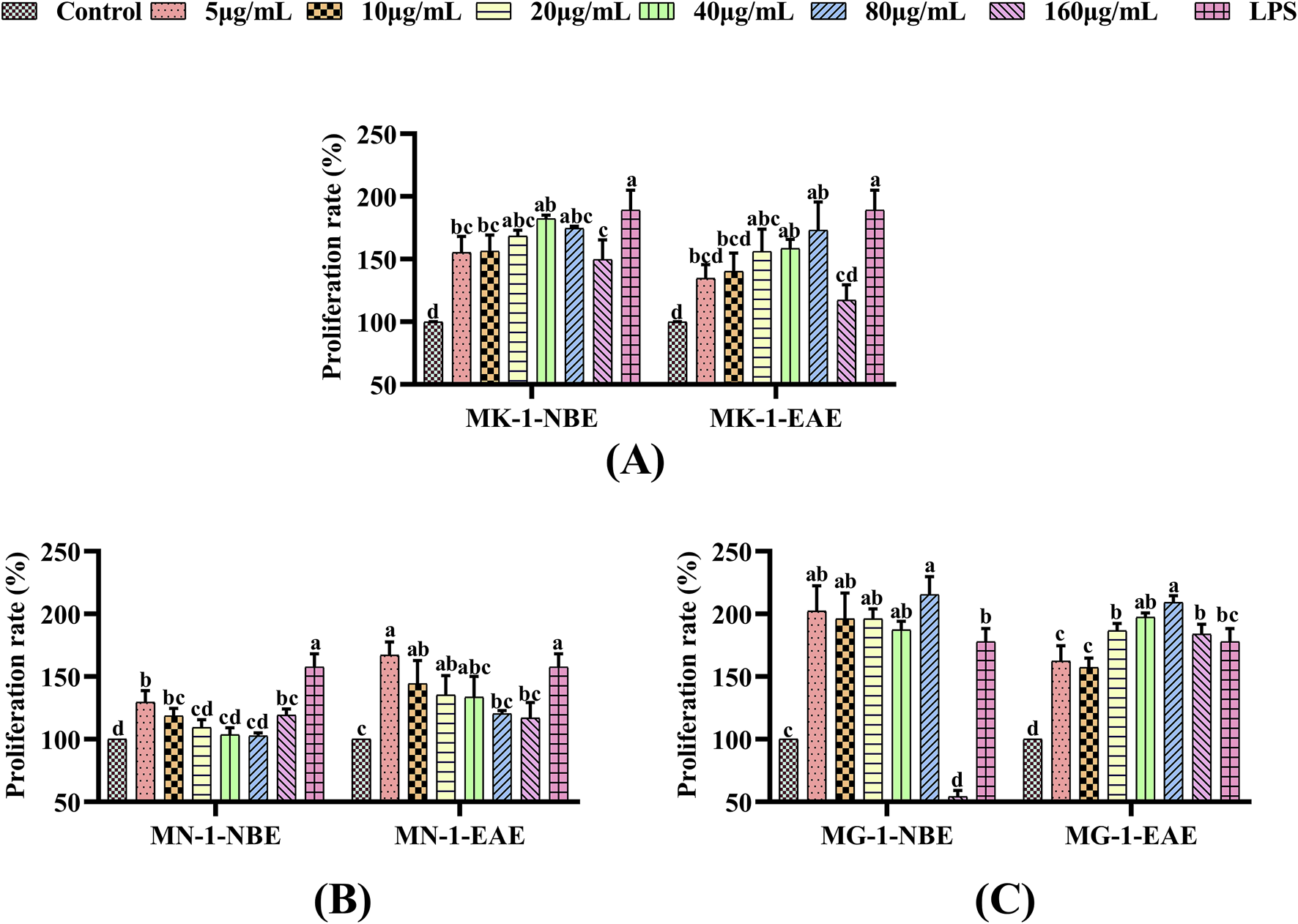 Effects of fermentation extracts of different fungi on the proliferation of RAW 264.7 cells: (A) MK-1; (B) MN-1; (C) MG-1. The data are expressed as mean ± SD. The different letters indicate significant differences (p < 0.05) among the groups.