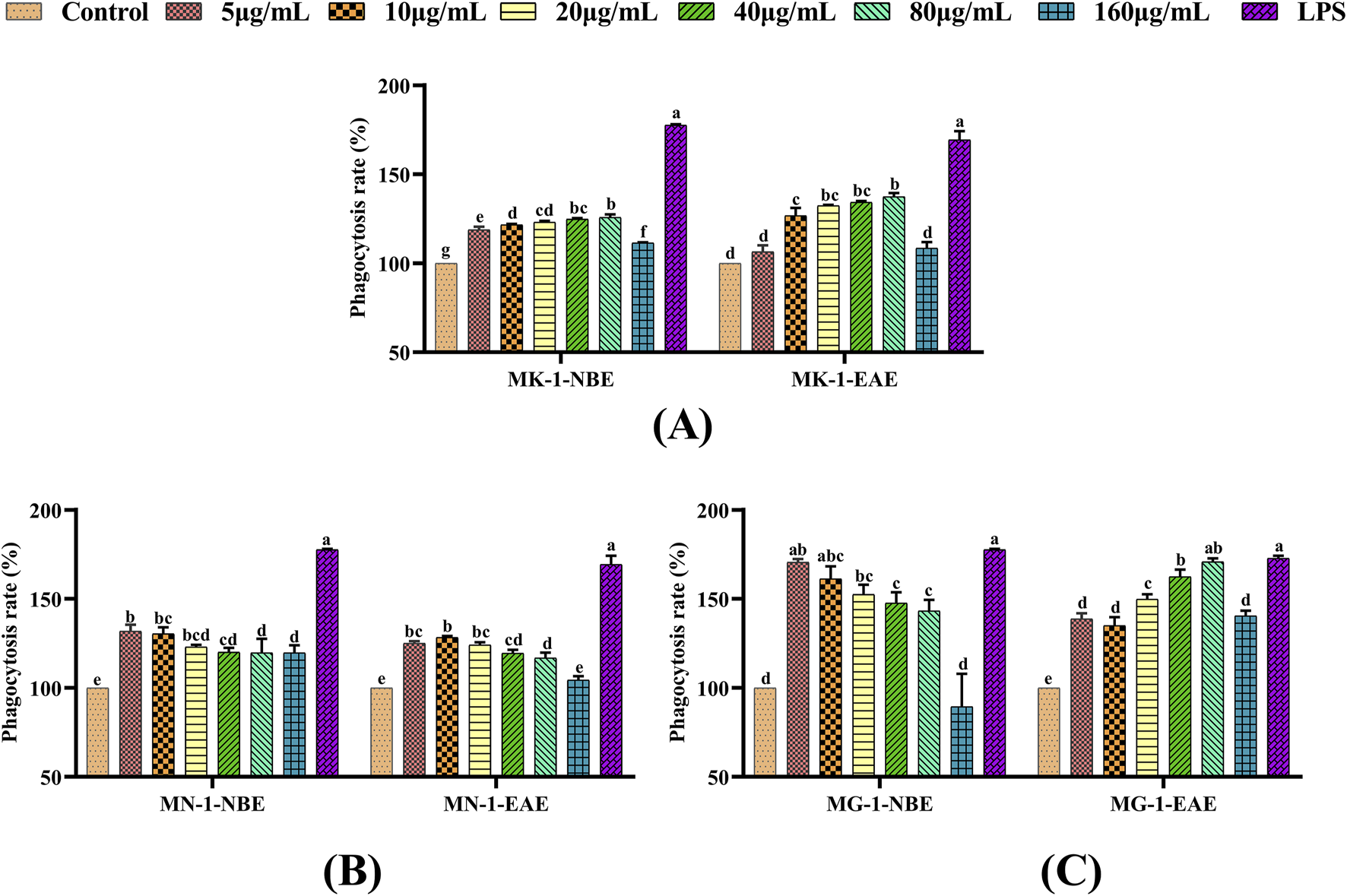 Effects of different fungal fermentation extracts on the phagocytosis ability of RAW 264.7 cells: (A) MK-1; (B) MN-1; (C) MG-1. The data are expressed as mean ± SD. The different letters indicate significant differences (p < 0.05) among the groups.
