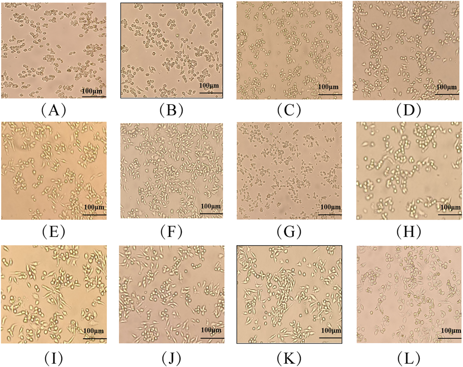 Effects of MG-1 fermentation broth on the cellular morphology of RAW 264.7 cells: (A) control; (B–F) MG-1-EAE at concentrations of 5, 10, 20, 40, and 80 μg/mL, respectively; (G–K) MG-1-NBE at concentrations of 5, 10, 20, 40, and 80 μg/mL, respectively; (L) lipopolysaccharides.
