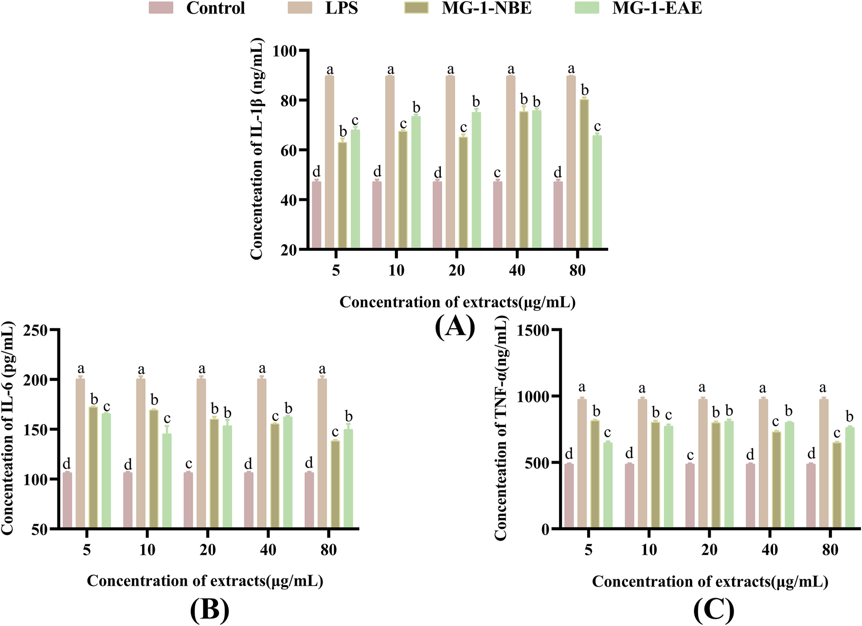 3.3.2 Effects of MG-1 crude extracts on the production of TNF-α, IL-1β, and IL-6 in RAW 264.7 cells