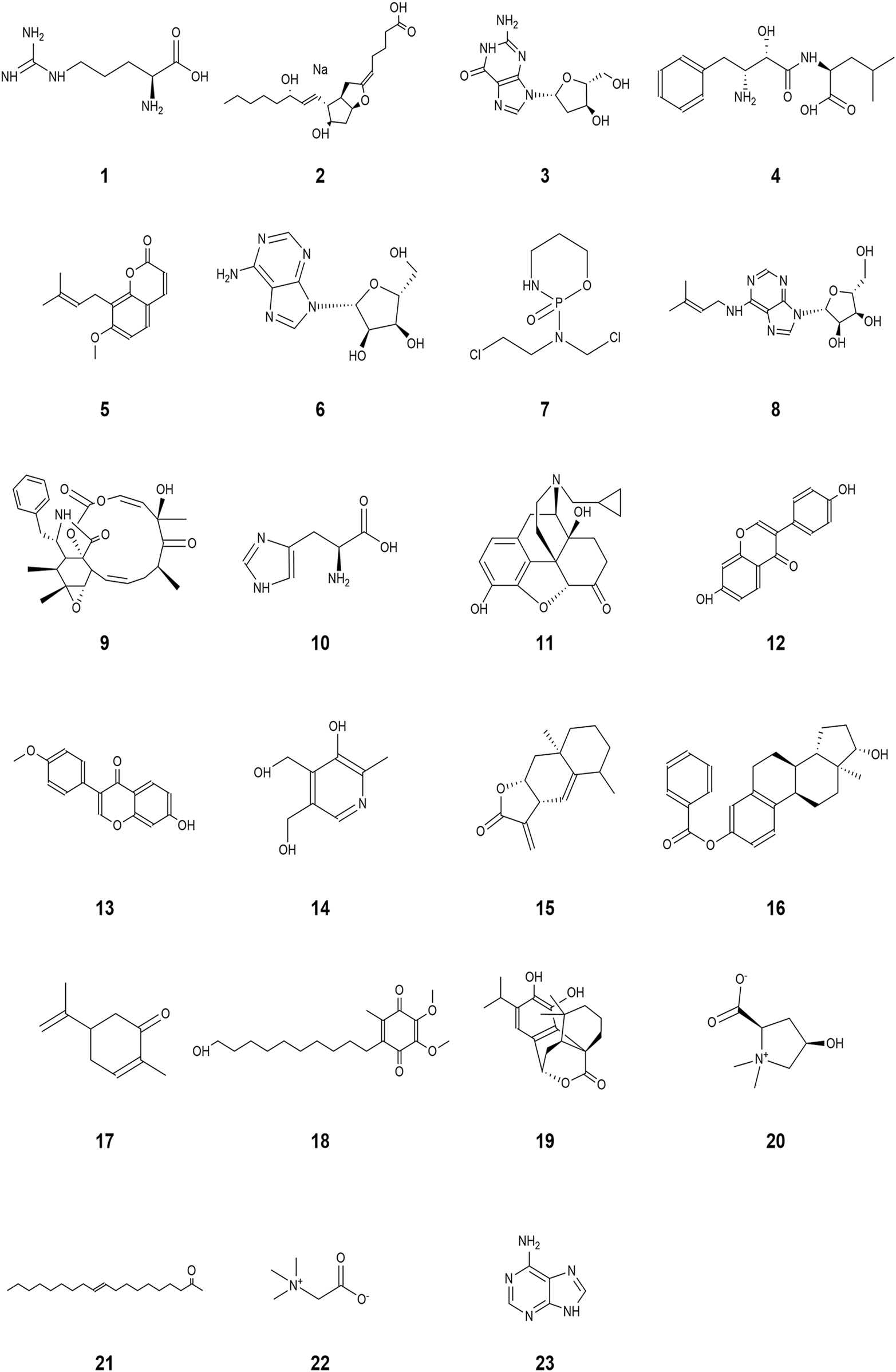 Structures with pharmacologically valuable activities identified from the bioactive components in MG-1: (1) L-arginine, (2) prostaglandin I2, (3) deoxyguanosine, (4) bestatin, (5) osthole, (6) adenosine, (7) cyclophosphamide, (8) isopentenyladenosine, (9) cytochalasin E, (10) L-histidine, (11) naltrexone, (12) daidzein, (13) formononetin, (14) pyridoxine, (15) alantolactone, (16) β-estradiol-3-benzoate, (17) carvone, (18) idebenone, (19) carnosol, (20) stachydrine, (21) oleamide, (22) betaine, and (23) adenine.