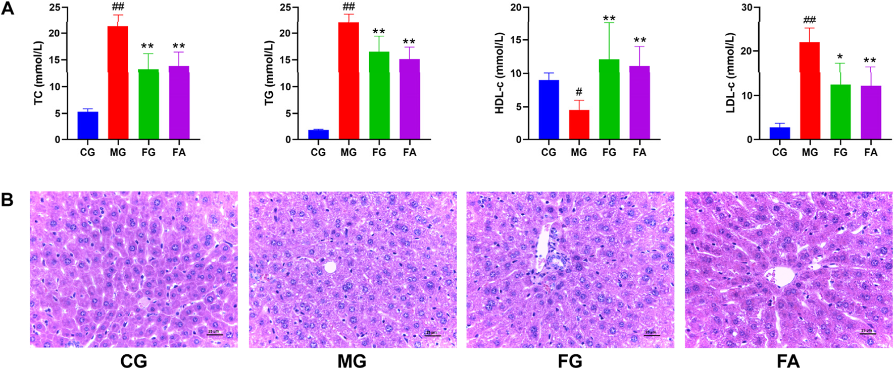 We determined serum levels of total cholesterol (TC), triglycerides (TG), high-density lipoprotein cholesterol (HDL-c), and low-density lipoprotein cholesterol (LDL-c) as depicted in Figure 2A. The serum TC, TG, and LDL-c levels were significantly elevated in the MG compared to the CG. However, both the FG and FA groups exhibited significant reductions in TG, TG, and LDL-c levels post-treatment. Conversely, HDL-c levels were significantly lower in the MG than in the CG, but markedly higher in both the FG and FA groups. These findings indicate that FA effectively mitigated dyslipidemia in hyperlipidemic mice.